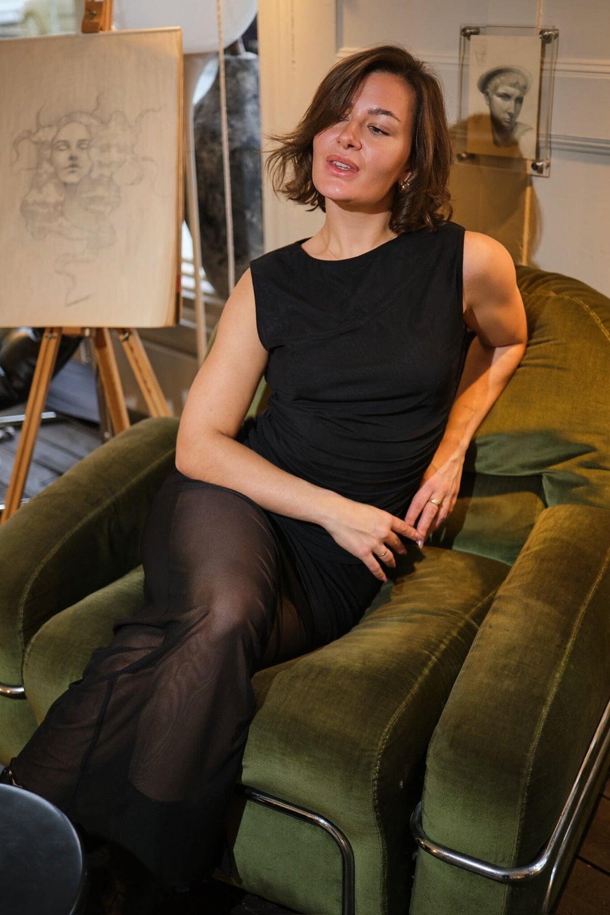 Zwarte mesh-top van Neo Noir met ronde halslijn. De top heeft rimpeldetails langs de zijkanten en op de schouders, wat het een gedrapeerd uiterlijk geeft.