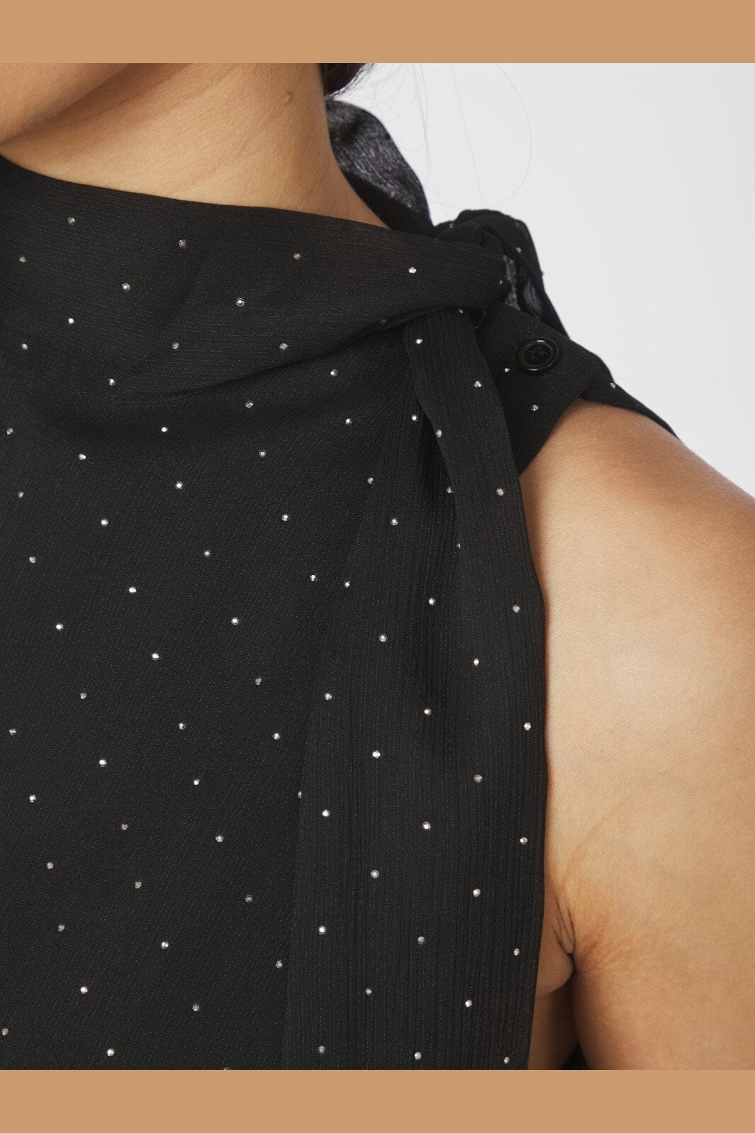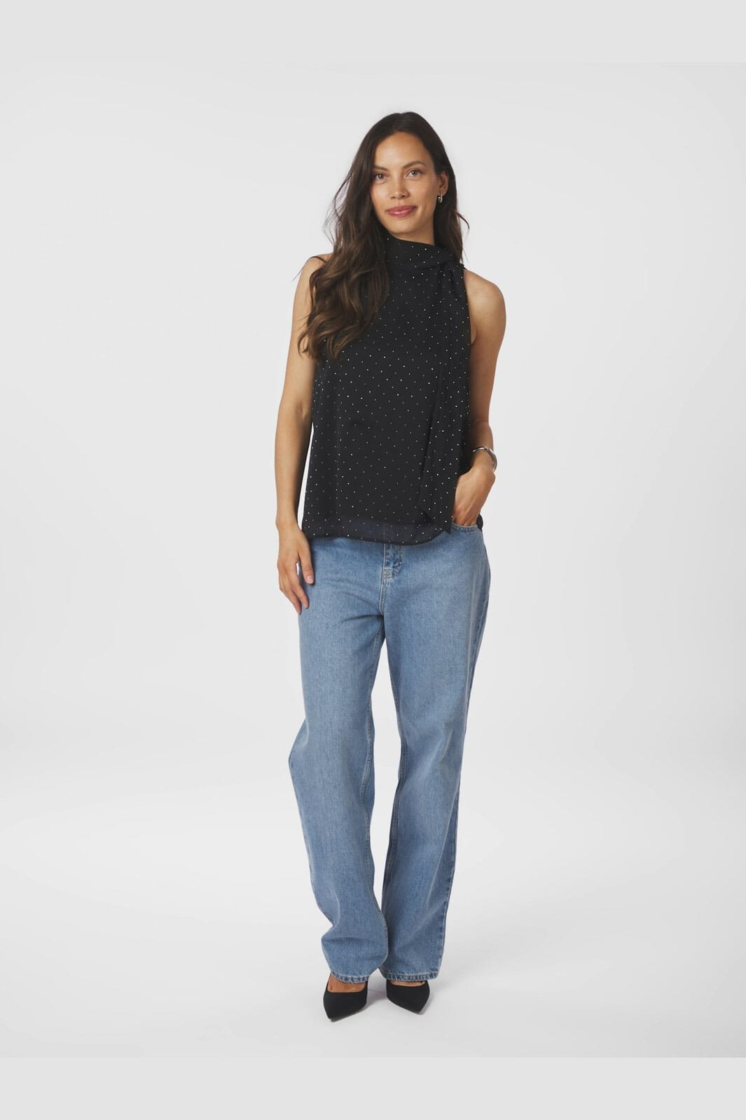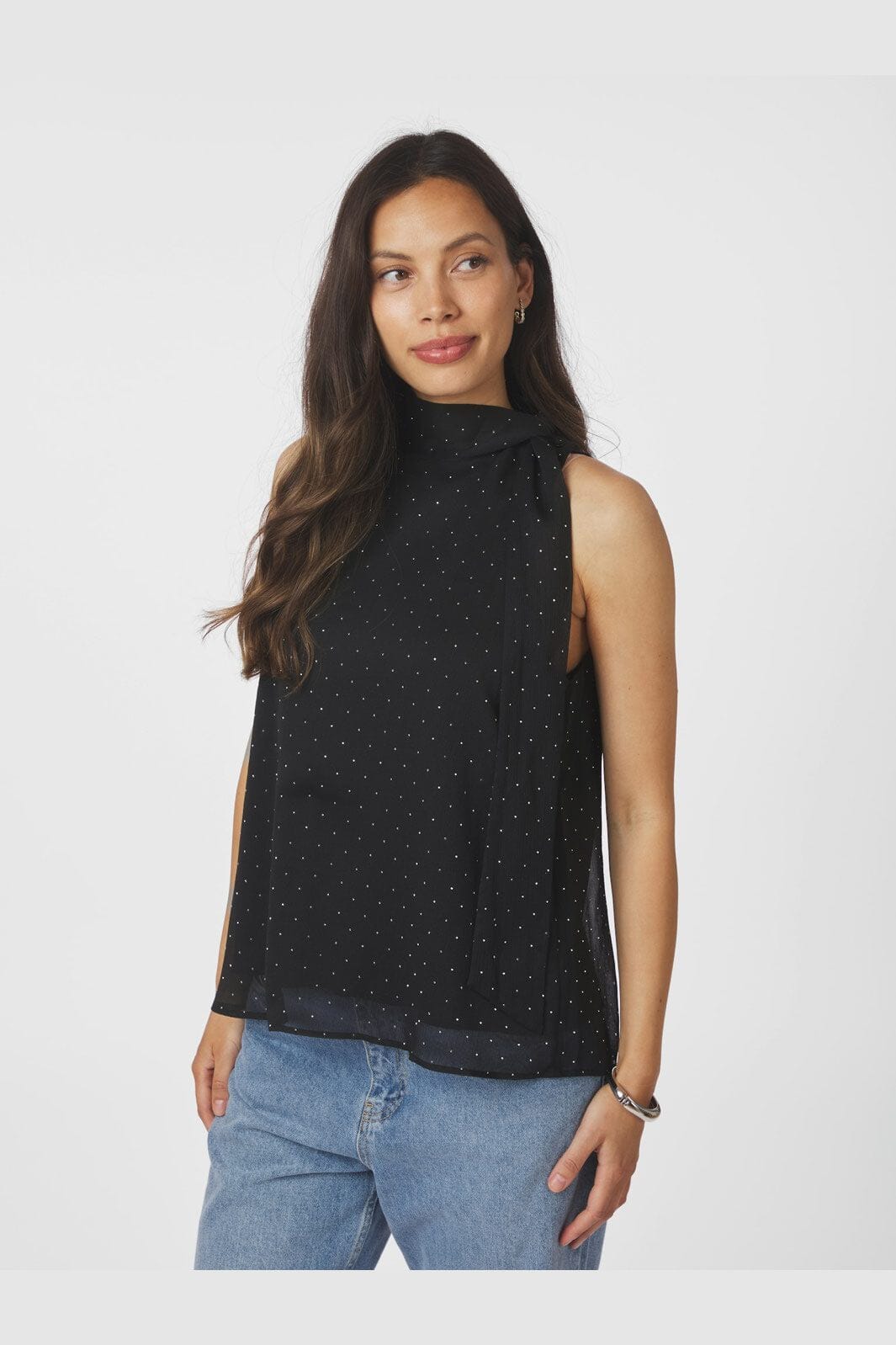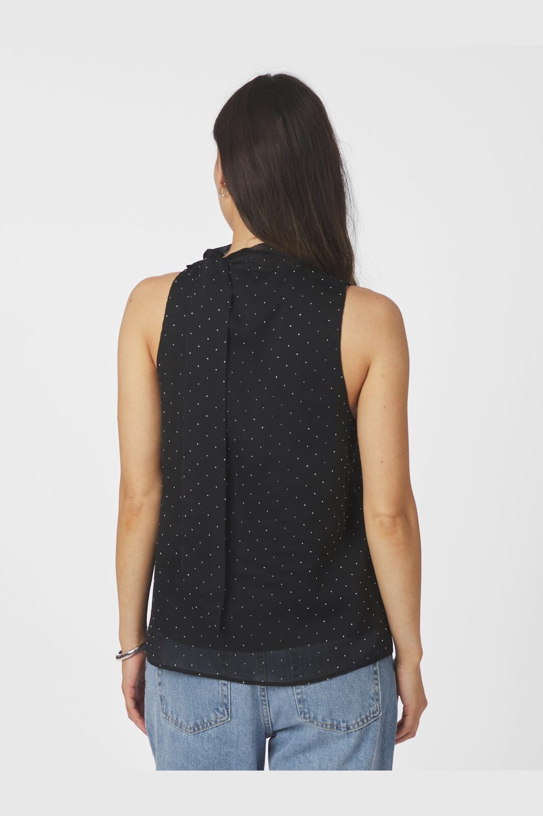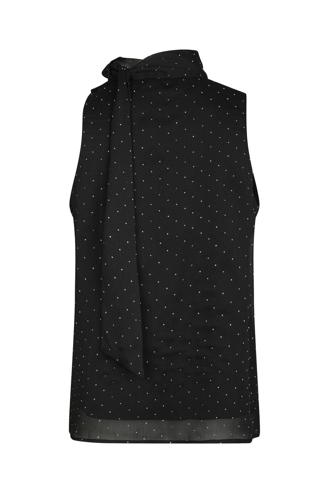 Zwarte top van Neo Noir met witte stippen en hoge hals. De top heeft een losse pasvorm en is gemaakt van chiffon met opgenaaide stenen en een strik bij de hals.