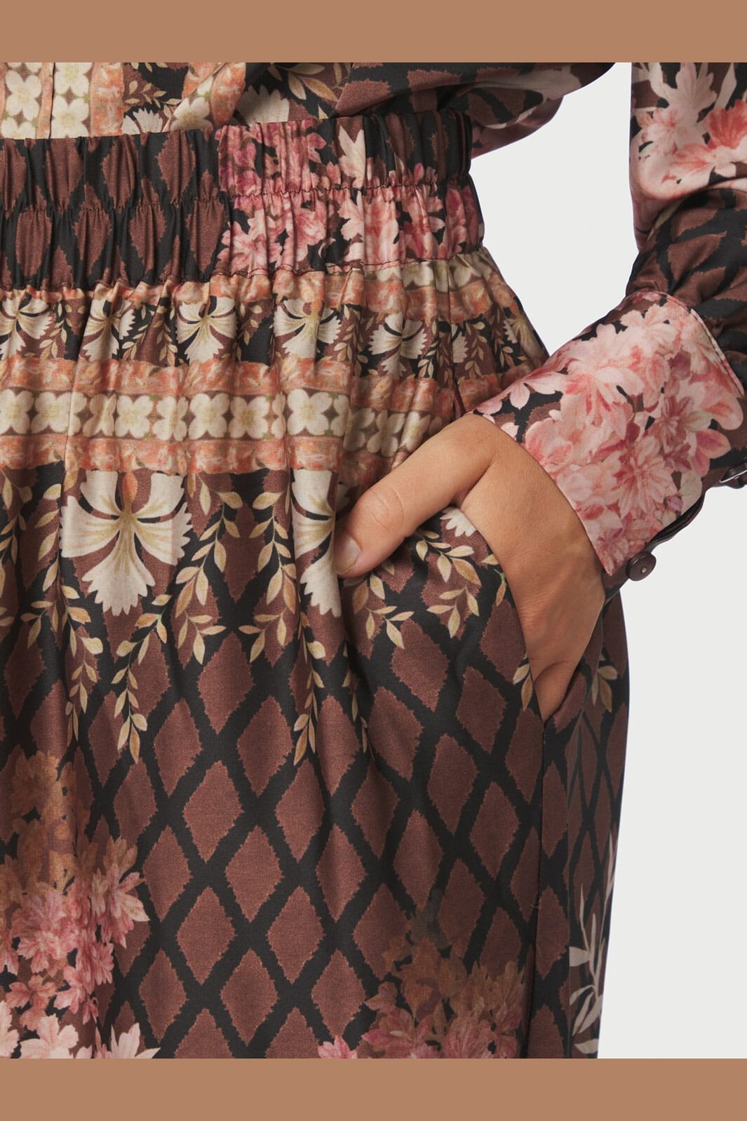 Zwarte broeken van Neo Noir met een botanisch patroon. De broeken hebben brede benen en een geometrische print gecombineerd met bloemen in roze tinten op een donkere achtergrond.