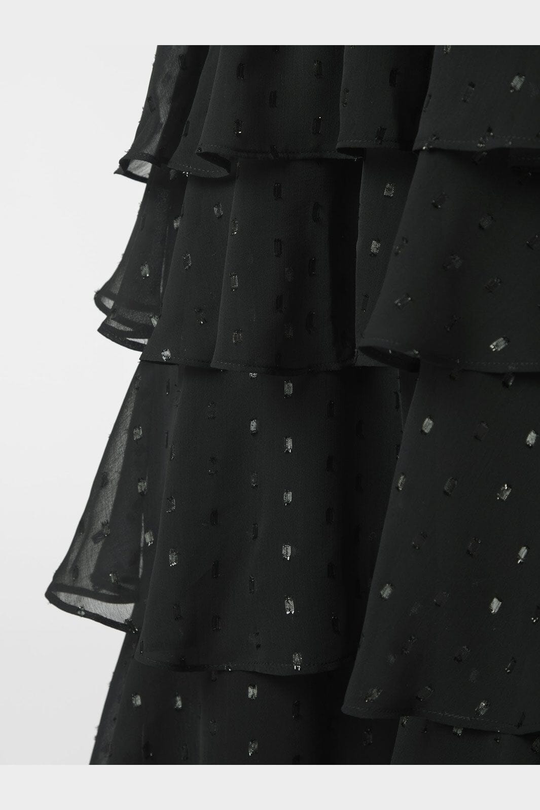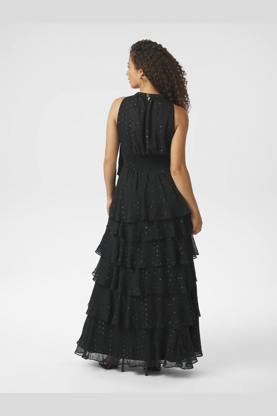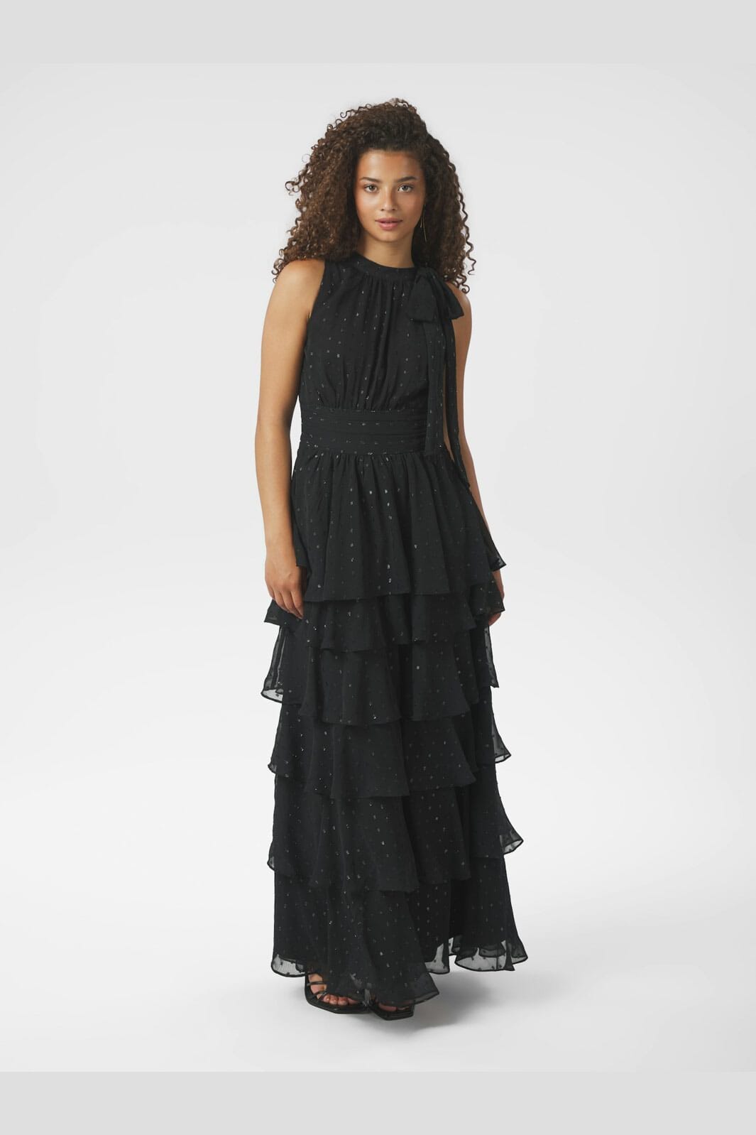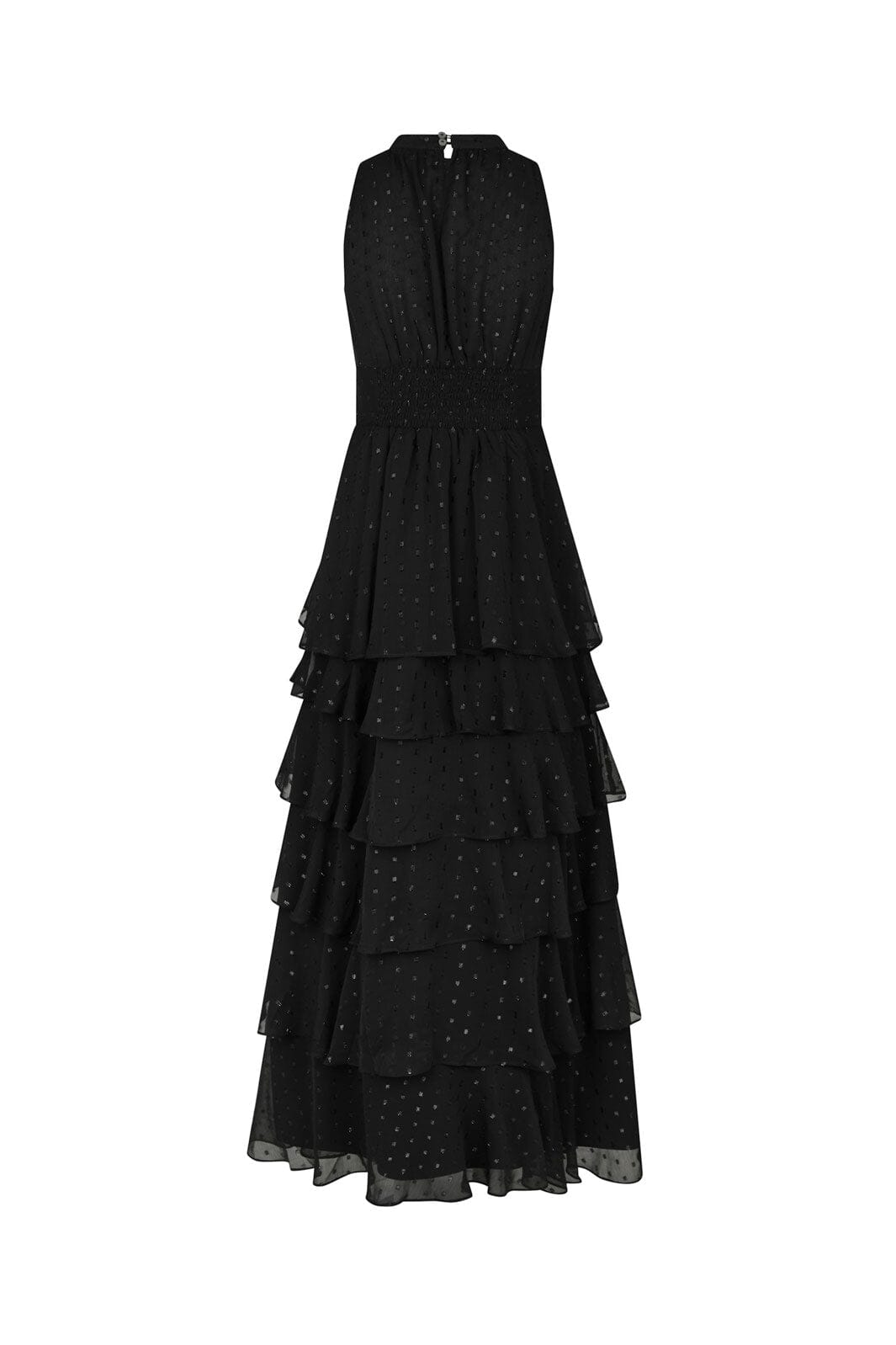 Zwarte lange jurk van Neo Noir in chiffonkwaliteit met stippenpatroon. De jurk heeft een hoge hals met strik en is opgebouwd uit meerdere lagen stof met ruches.