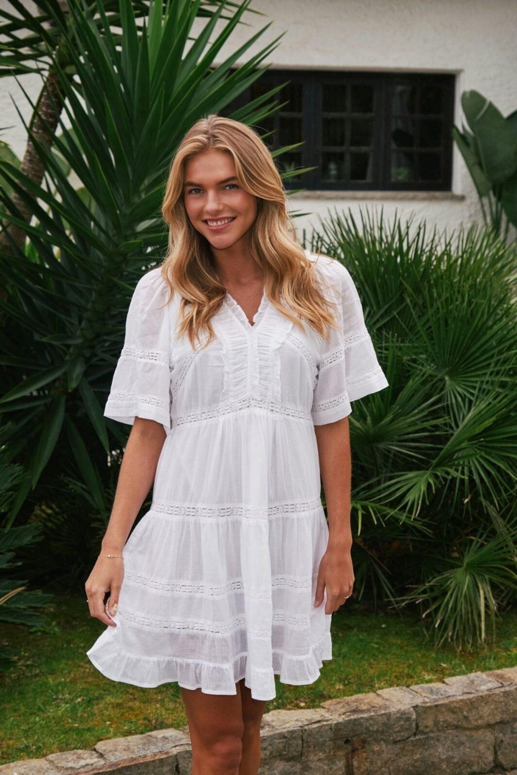 Witte voile jurk van Neo Noir met kantband en ruches. De jurk heeft korte mouwen en een V-hals met gerimpelde details langs de naden.