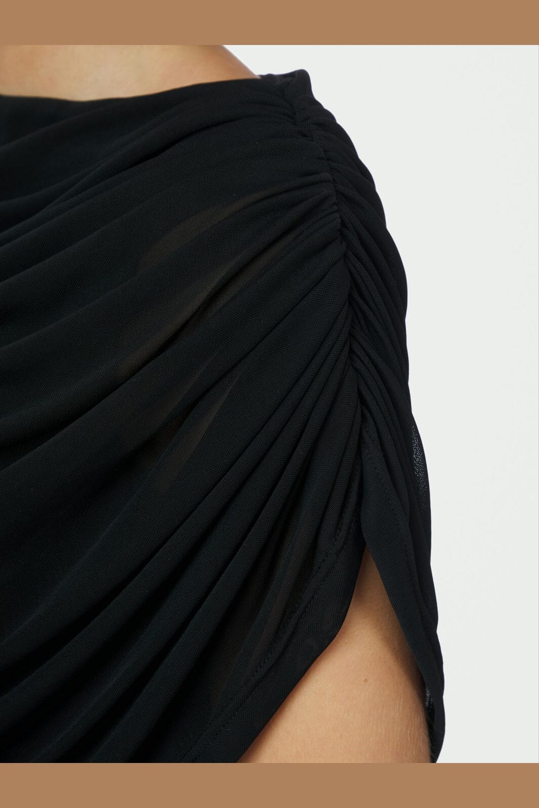 Zwarte mesh jurk van Neo Noir met gedrapeerd ontwerp. De jurk heeft plooien langs de zijnaad en een waterval-effect aan de voorkant, wat beweging in de stof creëert.