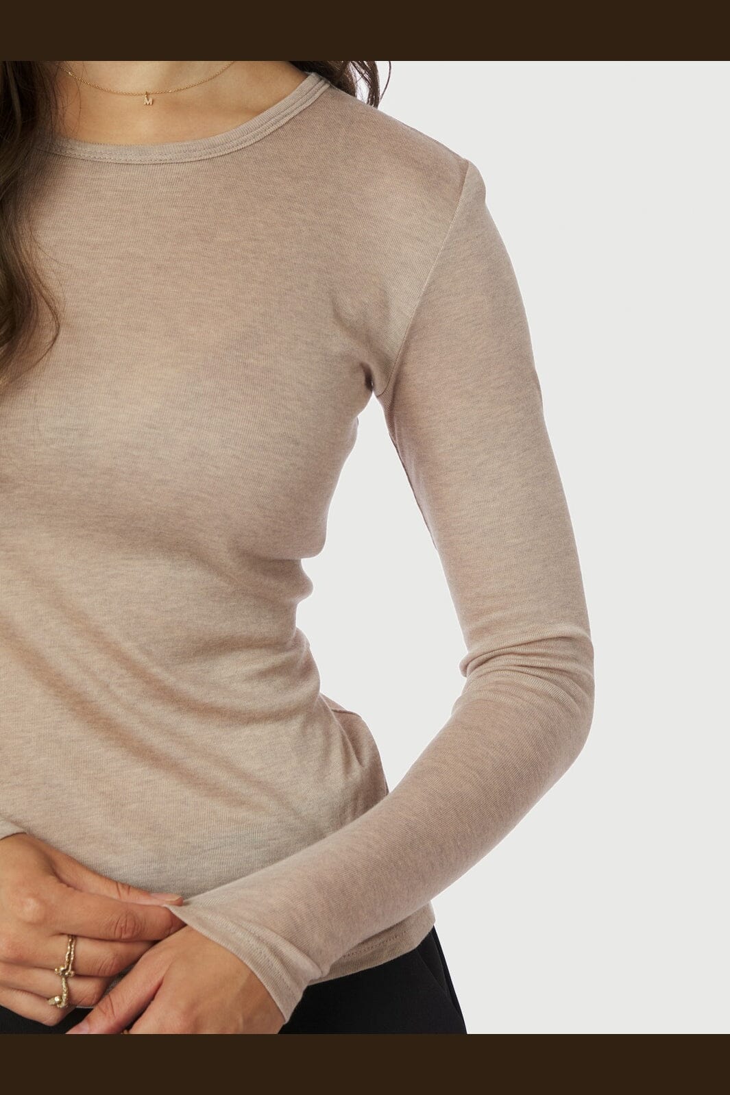 Beige melange-blouse van Neo Noir in ribgebreid materiaal. Een aansluitende blouse met ronde hals en lange mouwen in een neutrale kleur die bij veel andere kleuren past.