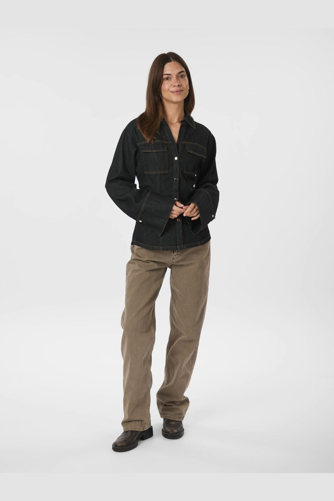 Zwarte denim blouse met schuine naden en ruches. De blouse heeft een aansluitende pasvorm met brede mouwen en manchetten. De gestructureerde kraag en zachte denim geven een klassieke uitstraling.