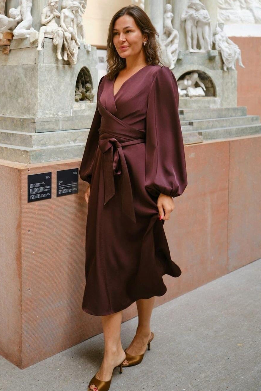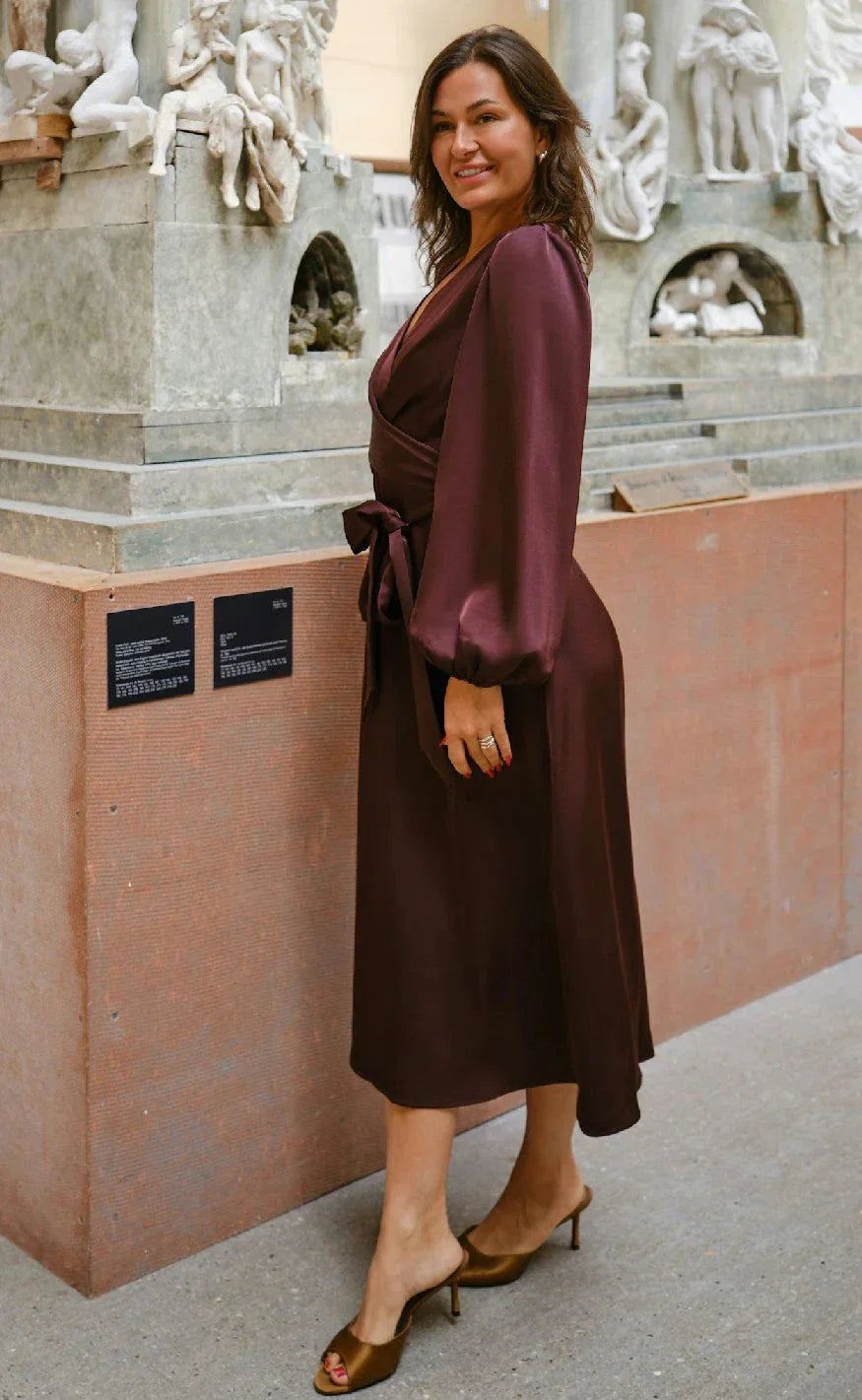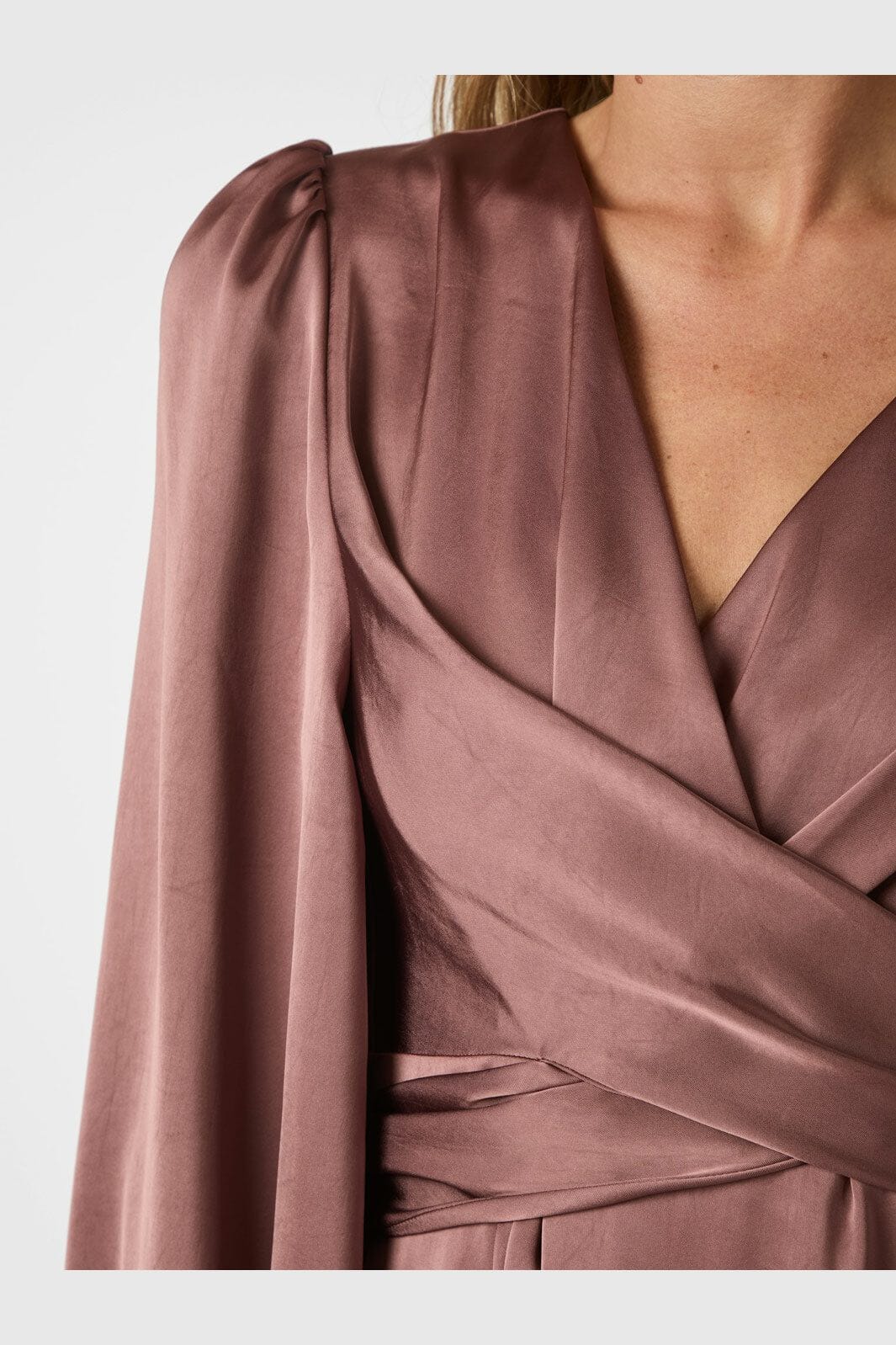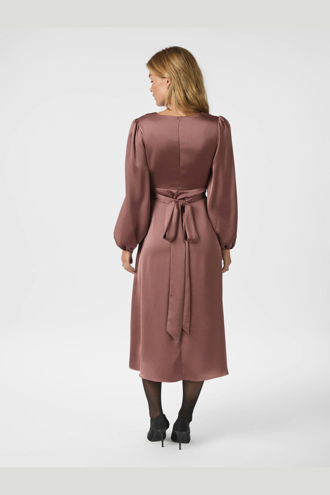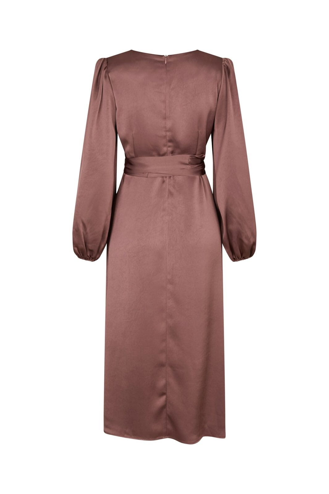 Satin jurk van Neo Noir in donkerroze. De jurk heeft een V-hals, lange mouwen met gerimpelde manchetten en een wikkelontwerp met een strikband in de taille.