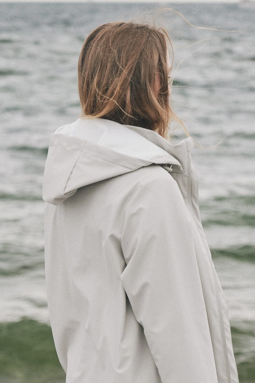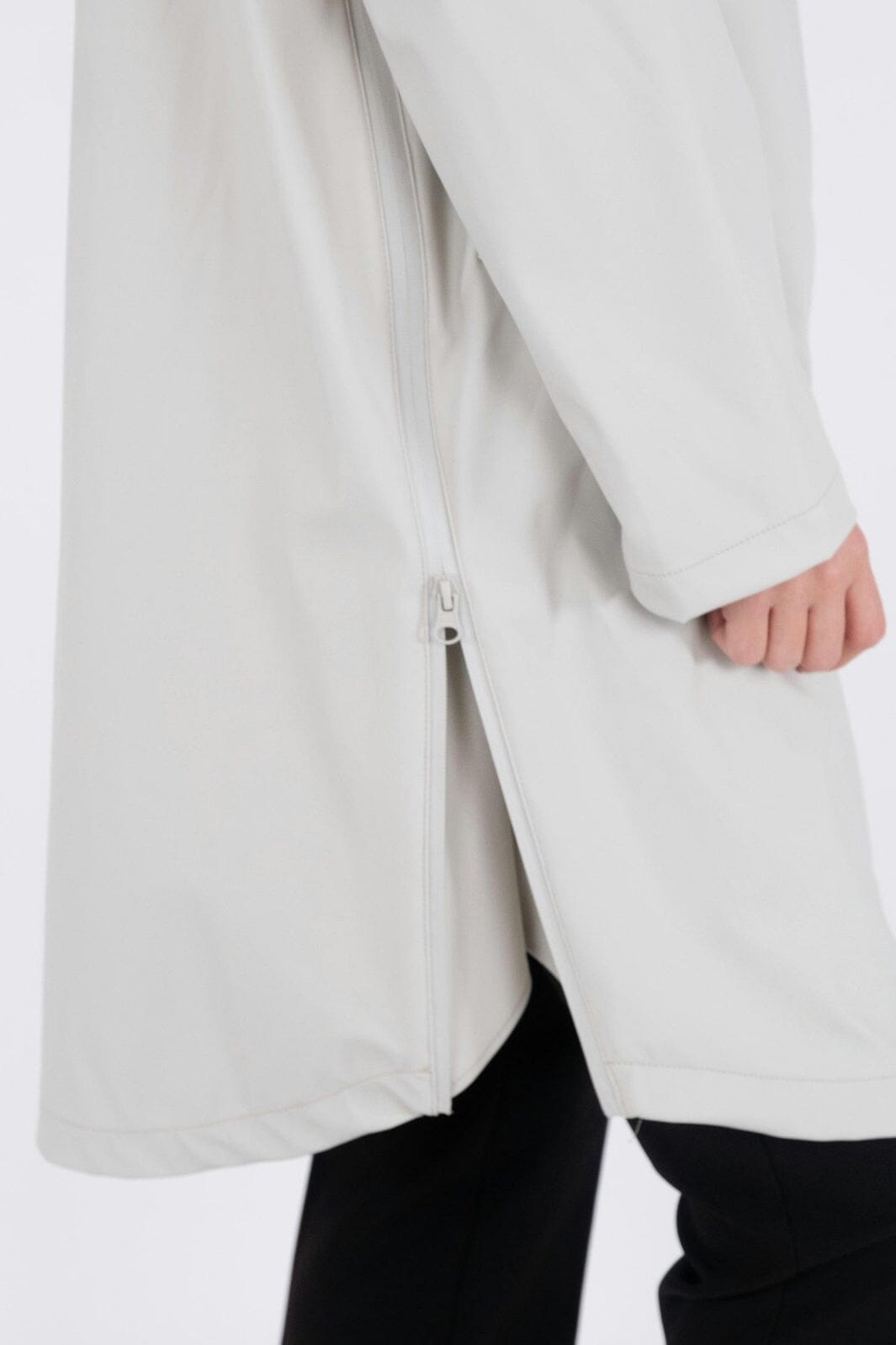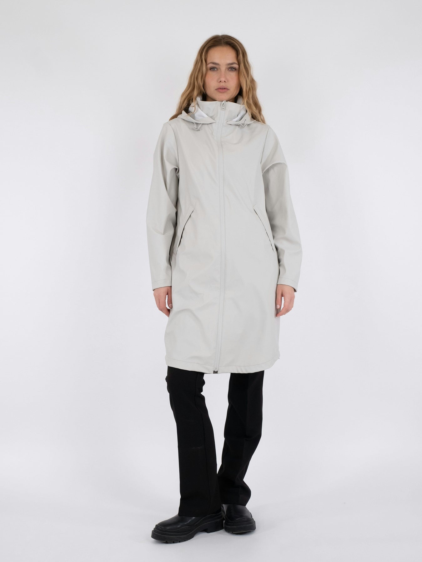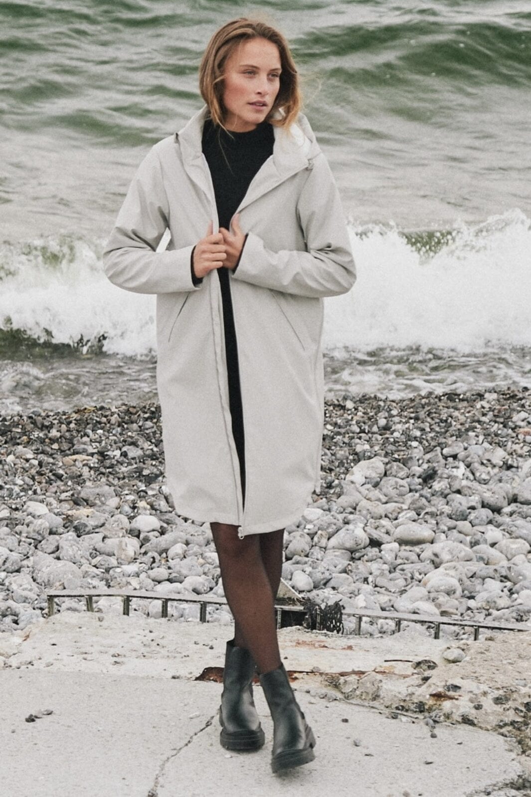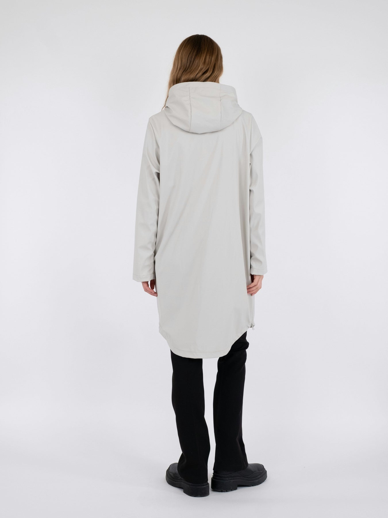 Gevoerde jas van Neo Noir in ivory. De regenbestendige jas heeft een zachte, matte afwerking met een afneembare capuchon en praktische zijzakken met rits.