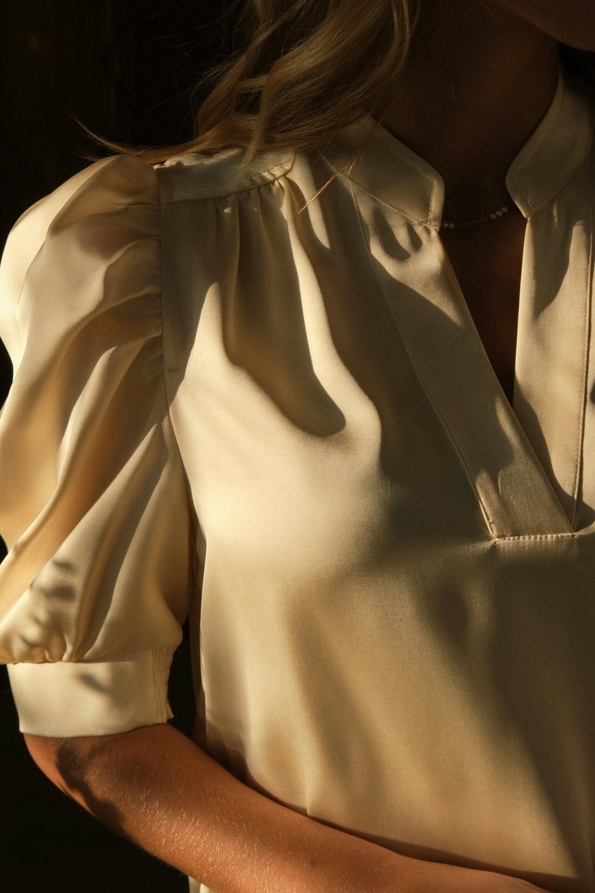 Blouse van Neo Noir in lichtgeel, gemaakt van matte satijn. De blouse is geschikt voor zowel formele gelegenheden als voor alledaags en feestelijk gebruik.