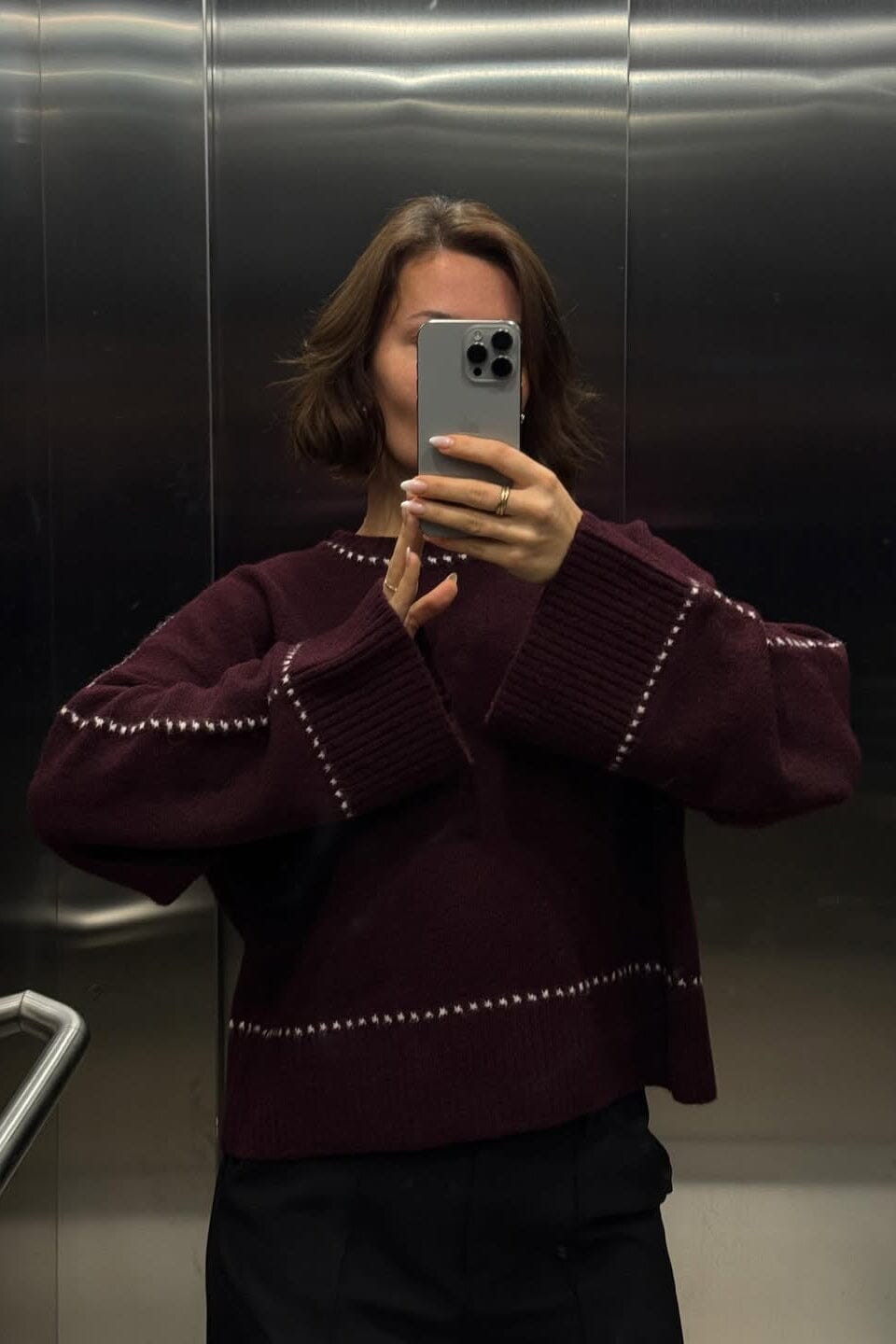 Wijnrode gebreide trui van Neo Noir met ronde hals en zichtbare stiksels. De trui heeft een losse pasvorm en lange mouwen met decoratieve stiksels.