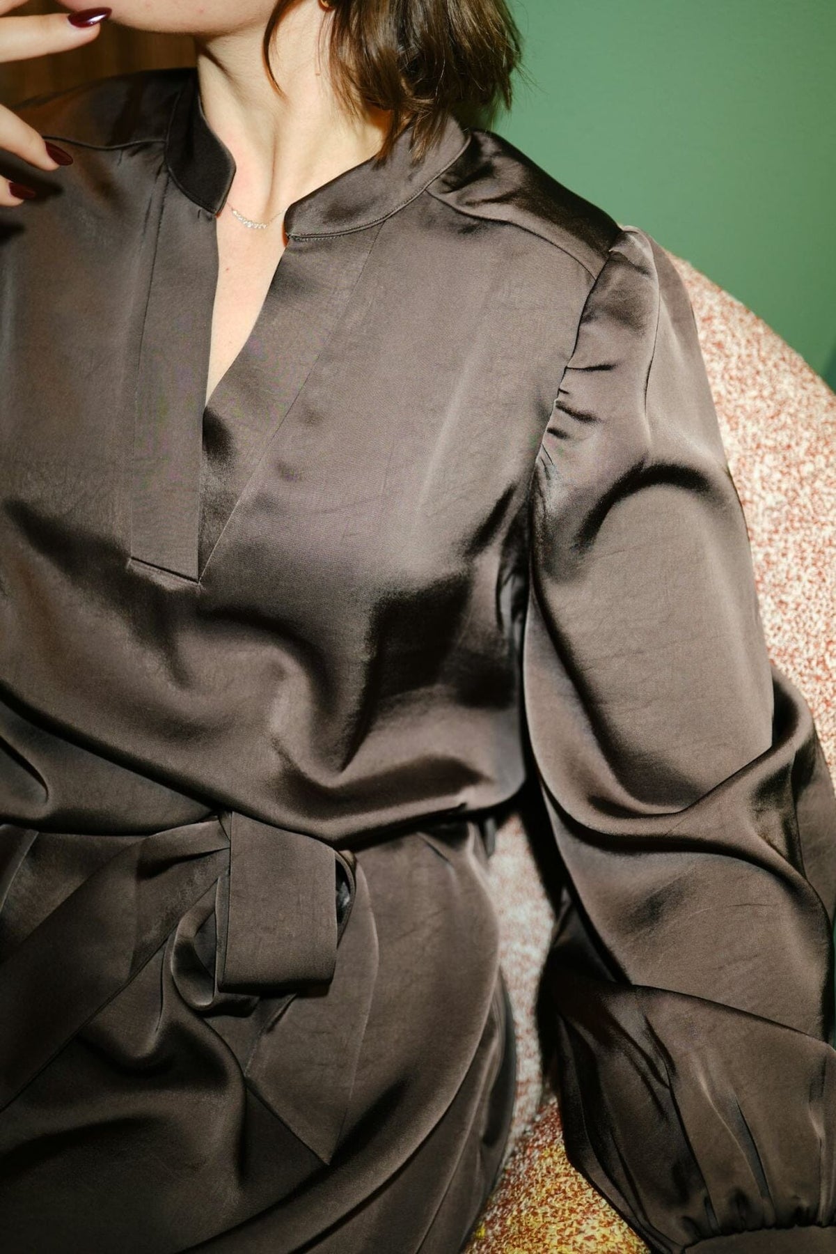 Donkerbruin satijnen jurk van Neo Noir met lange mouwen en manchetten. De jurk heeft een V-hals en een strikceintuur in de taille die naar wens kan worden aangepast.