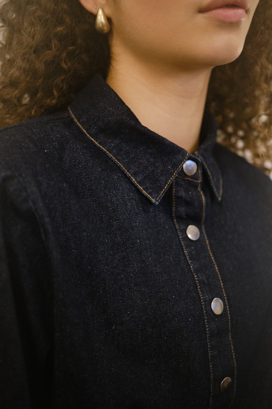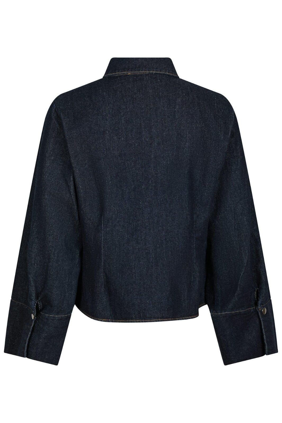 Donkerblau denim shirt van Neo Noir in dunne en zachte denim. Het shirt heeft een kraag en brede manchetten op de lange mouwen.