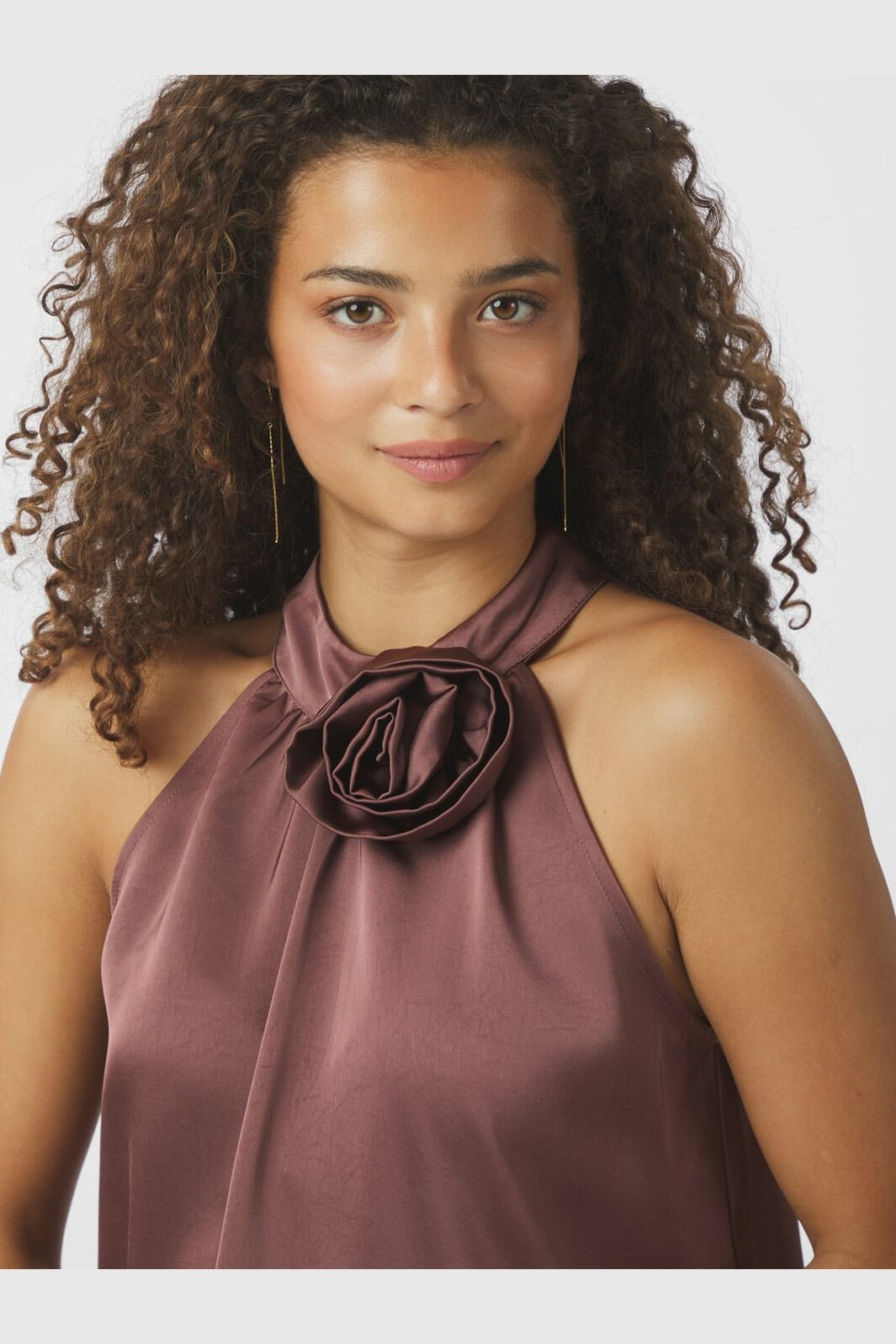 Sateen-top van Neo Noir in donkerroze. De top heeft een hoge hals met halterneck-design en een decoratieve roos bij de kraag. Het is gemaakt van fijne satijn met een gladde oppervlakte.