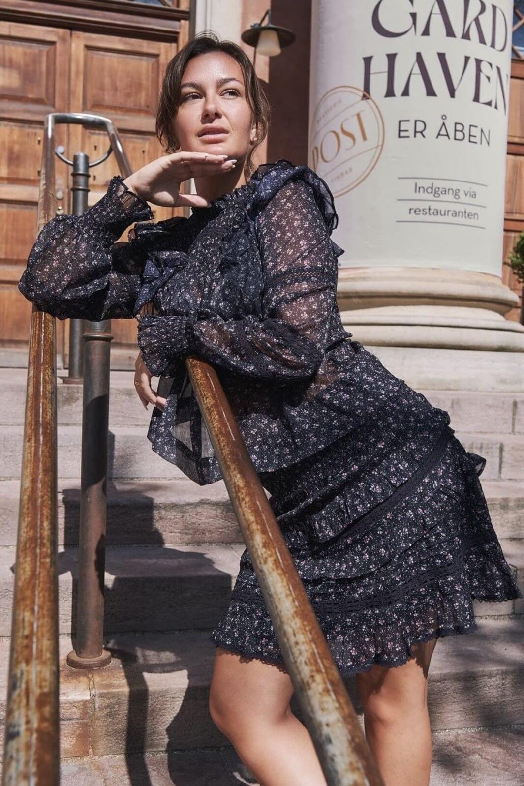 Zwarte blouse met bloemenpatroon van Neo Noir. De blouse heeft een losse pasvorm met hoge hals en ruchesdetails. De stof is licht doorschijnend met een fijn bloemenpatroon.