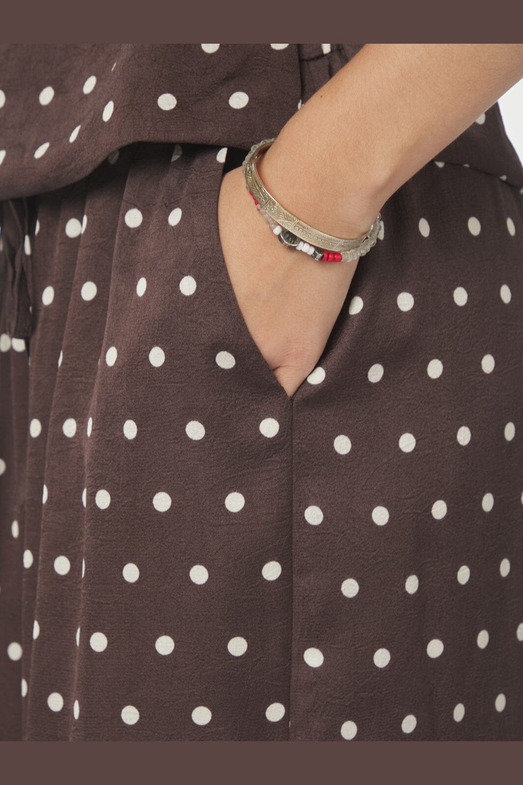 Donkerbruine broek van Neo Noir met witte stippen. Gemaakt van 100% polyester met een losse pasvorm en vloerlang model.