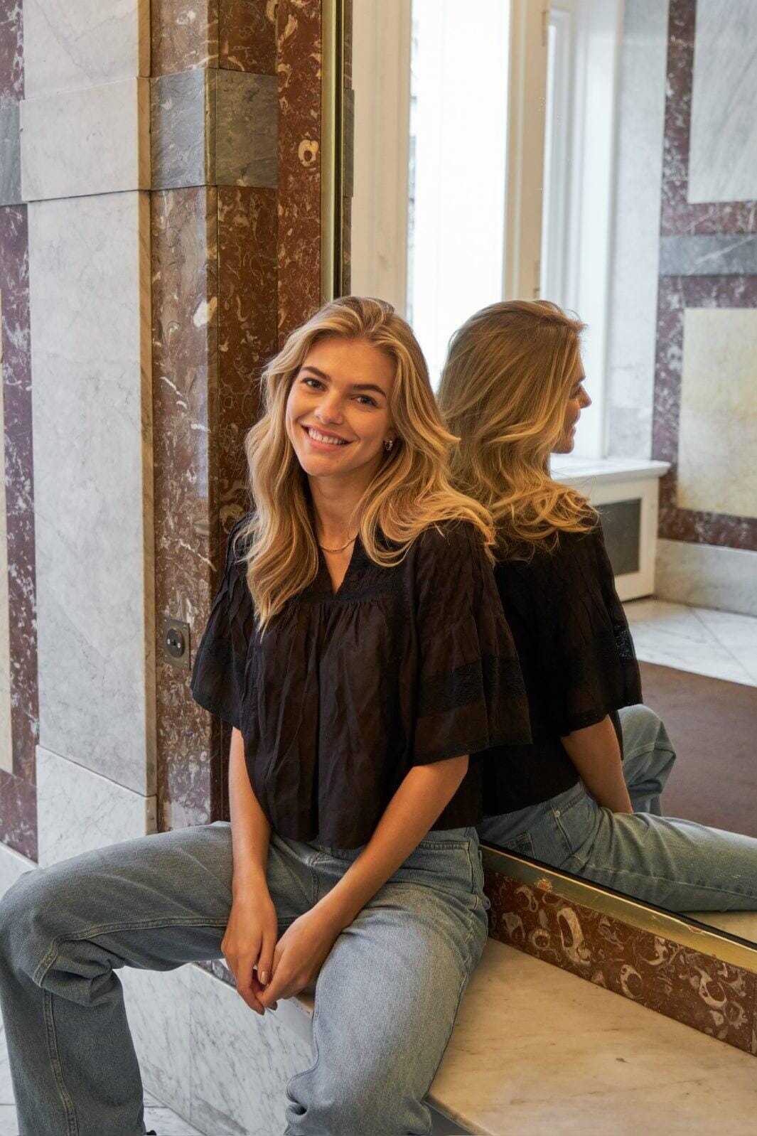 Zwarte voile-blouse van Neo Noir met een losse pasvorm. De blouse heeft banddetails en kleine plooien bij de halslijn, evenals brede 3/4-mouwen die net boven de elleboog eindigen.