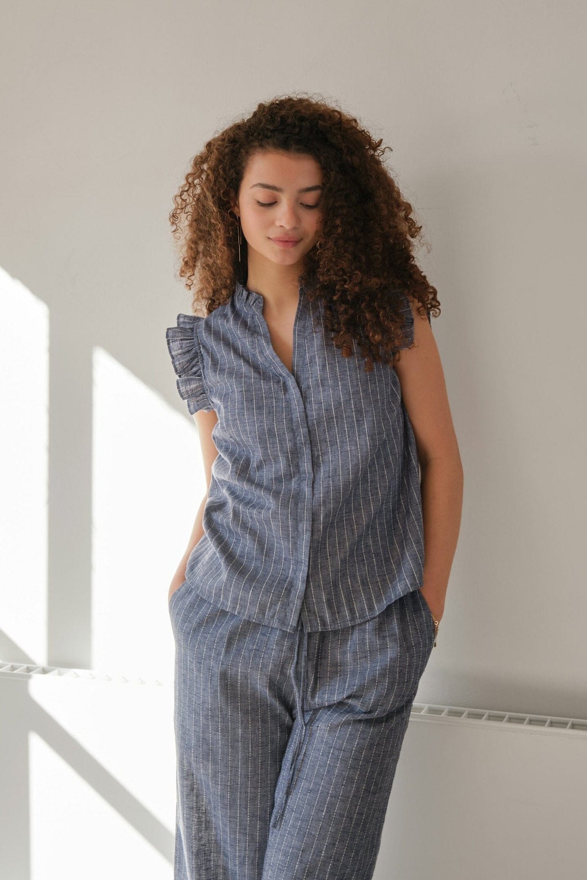 Blau topje van Neo Noir met verticale witte strepen. Het topje is gemaakt van 100% katoen en heeft geplooide mouwen.