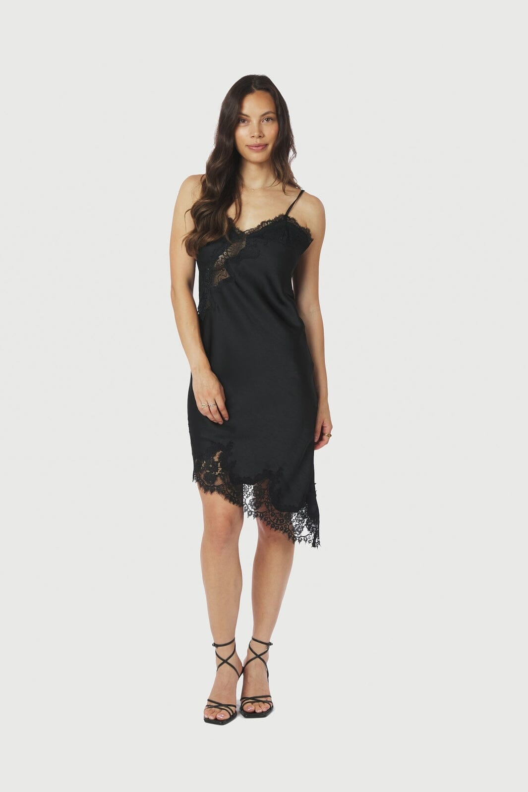 Zwarte kanten jurk van Neo Noir met asymmetrische rand. De jurk heeft dunne bandjes en kantdetails bij de V-hals en langs de onderste rand.