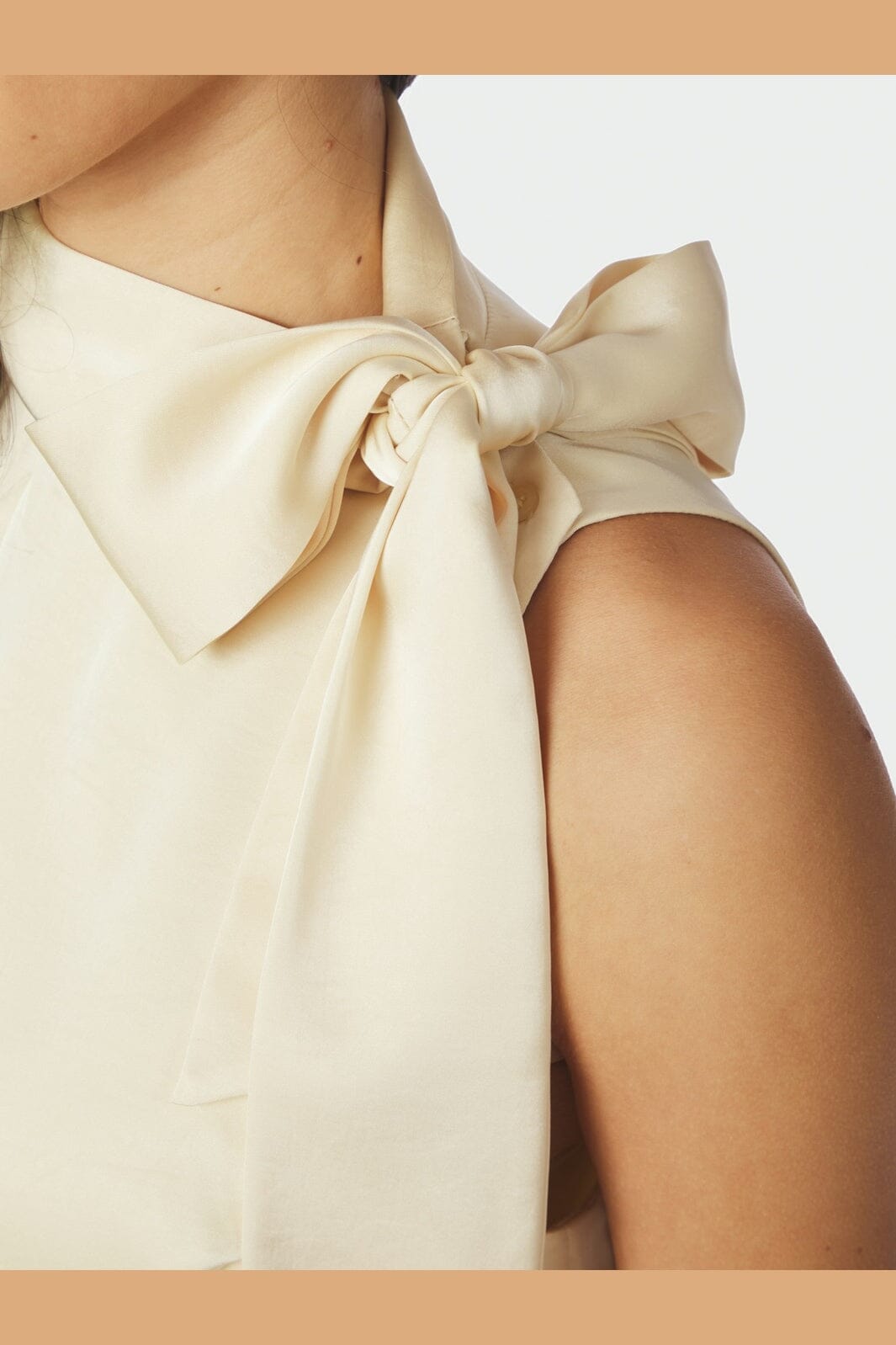 Satijnen top van Neo Noir in lichtgele kleur. De top is gemaakt van satijn en heeft een hoge halslijn met strikdetail op één schouder.