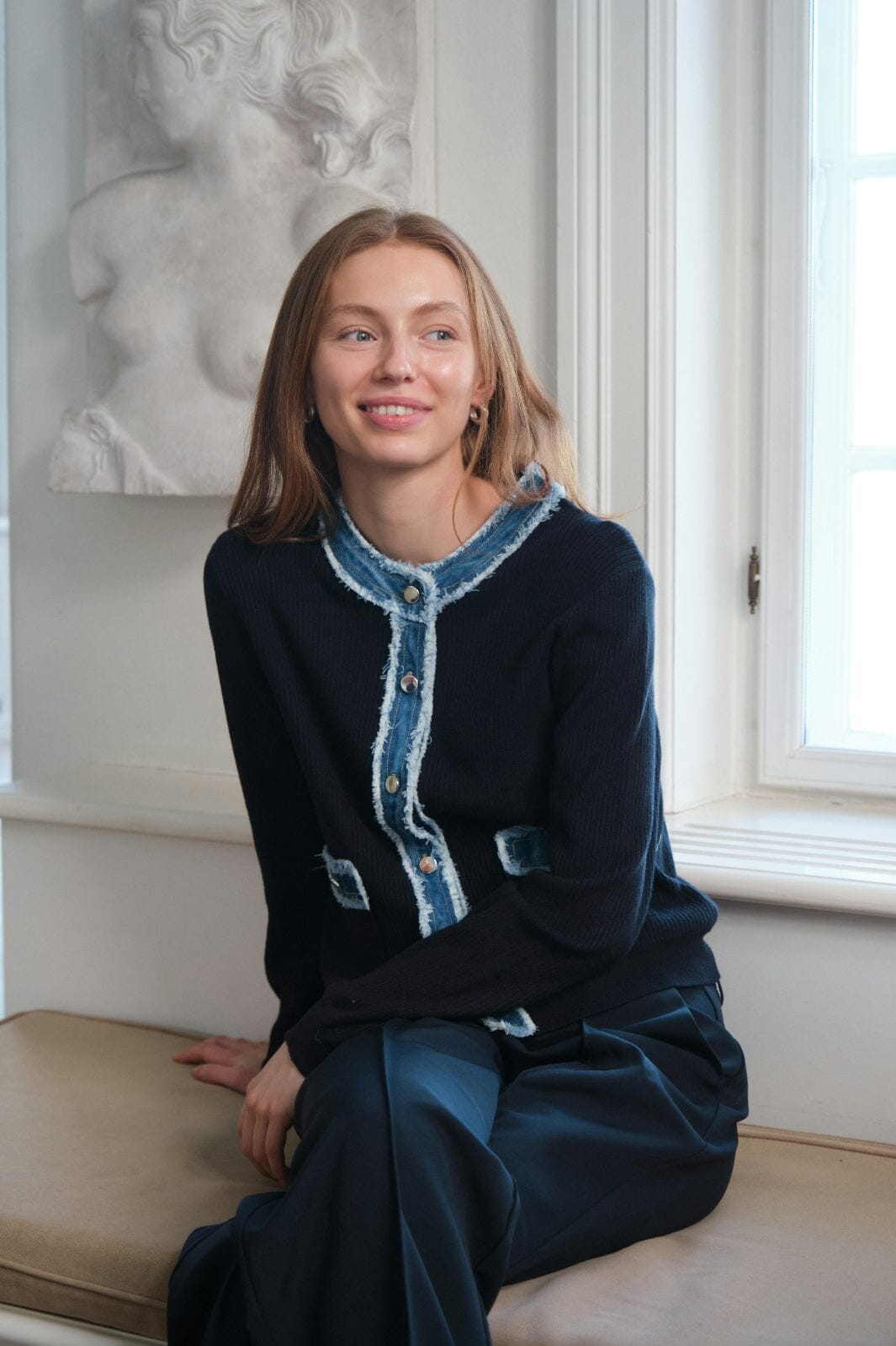 Donkerblau gebreide cardigan van Neo Noir met denimranden bij de kraag en zakken. De cardigan heeft knopen aan de voorkant en ruches die een zachte uitstraling geven.