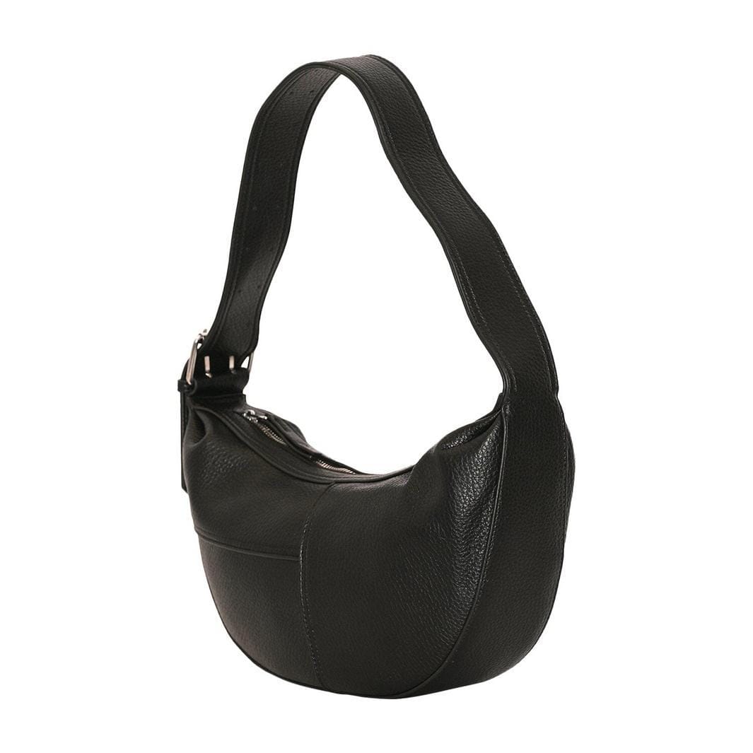 Zwarte schoudertas van Noella met gebogen vorm en gestructureerd oppervlak. De tas heeft een ruime binnensectie en een praktische ritssluiting aan de bovenkant.
