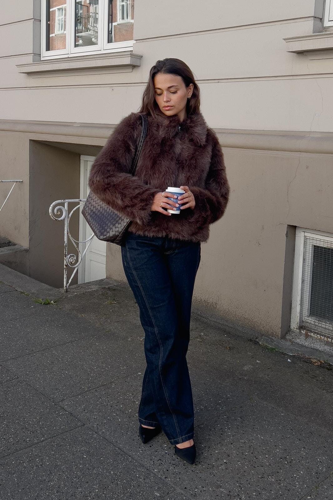 Chocoladebruine jas van Noella, gemaakt van faux bont met een fluffy textuur. De jas heeft een hoge kraag en sluit met een rits aan de voorkant.