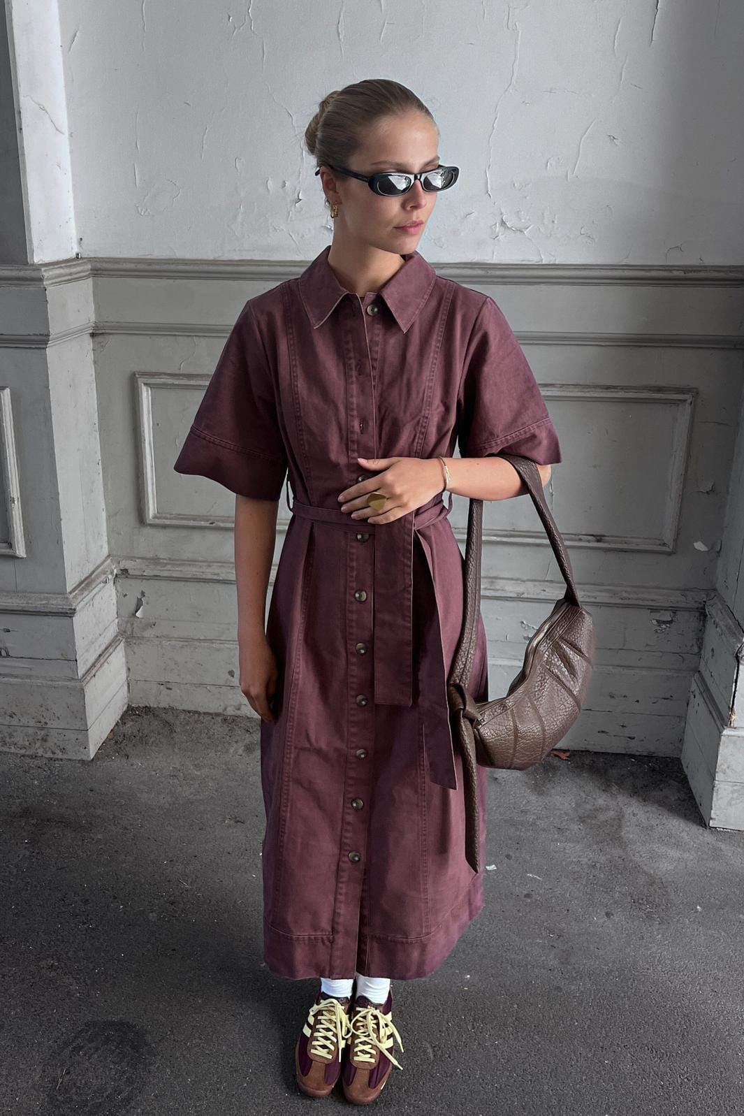 Shirtdress van Noella in de kleur Crushed Berry, een donkere rood-paarse tint. De jurk is gemaakt van 100 % katoen en heeft decoratieve stiksels.