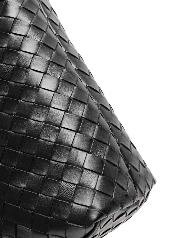 Zwarte tas van Noella met gevlochten oppervlak en ruime binnenkant. De tas heeft binnenzakken voor het organiseren van de inhoud en sluit met een rits.