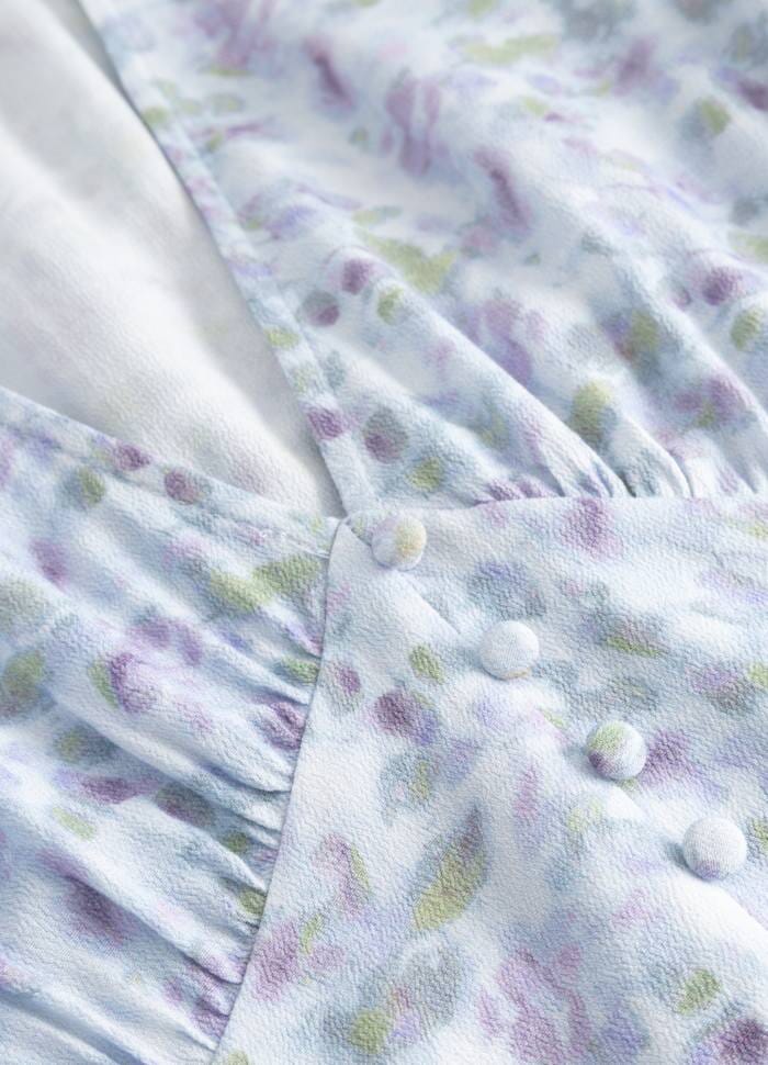 Maxi-jurk van Noella in blauw en paars bloemenprint. De V-hals en de losse pasvorm bieden veel bewegingsvrijheid. De lange mouwen hebben manchetten en de jurk sluit met knopen aan de voorkant.
