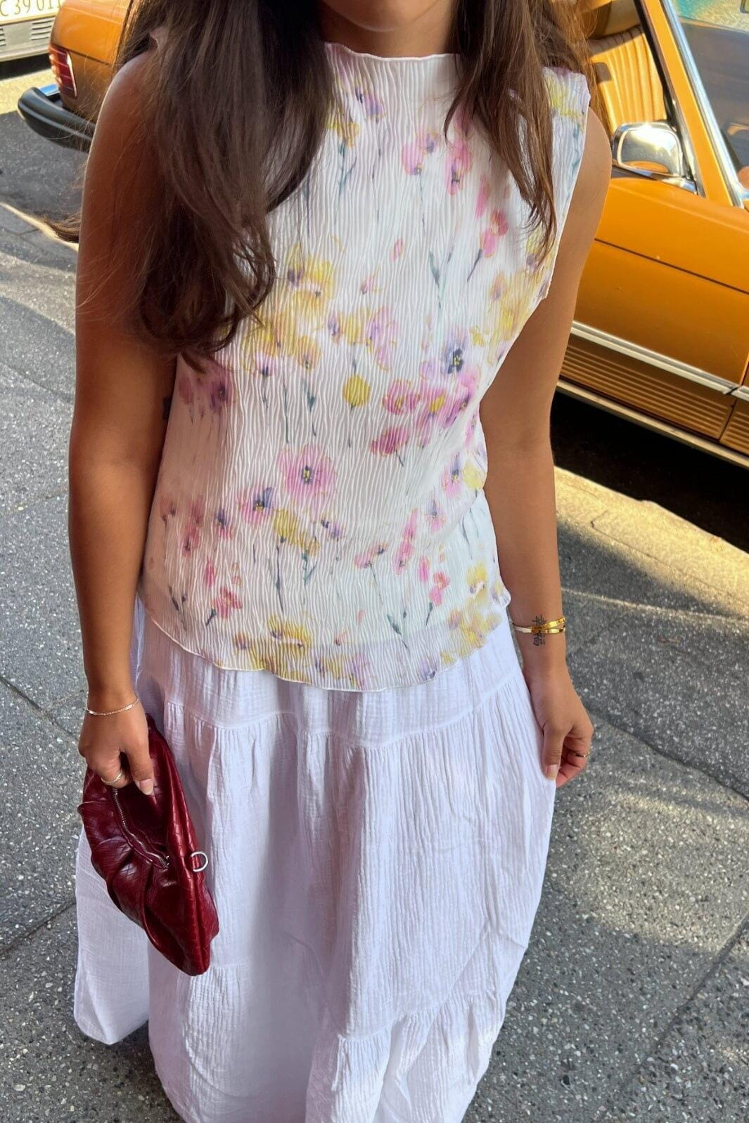 Mouwloze top van Noella met bloemenprint in wit en pastelkleuren. De top heeft een ronde halslijn en is versierd met een slaakant die beweging in de stof creëert.