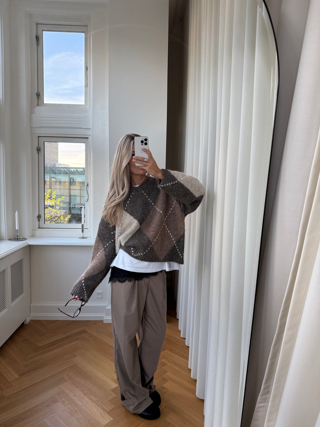 Gebreid vest van Noella in bruine en beige tinten met een klassiek argylepatroon. Het vest heeft een V-hals en wordt gesloten met knopen.