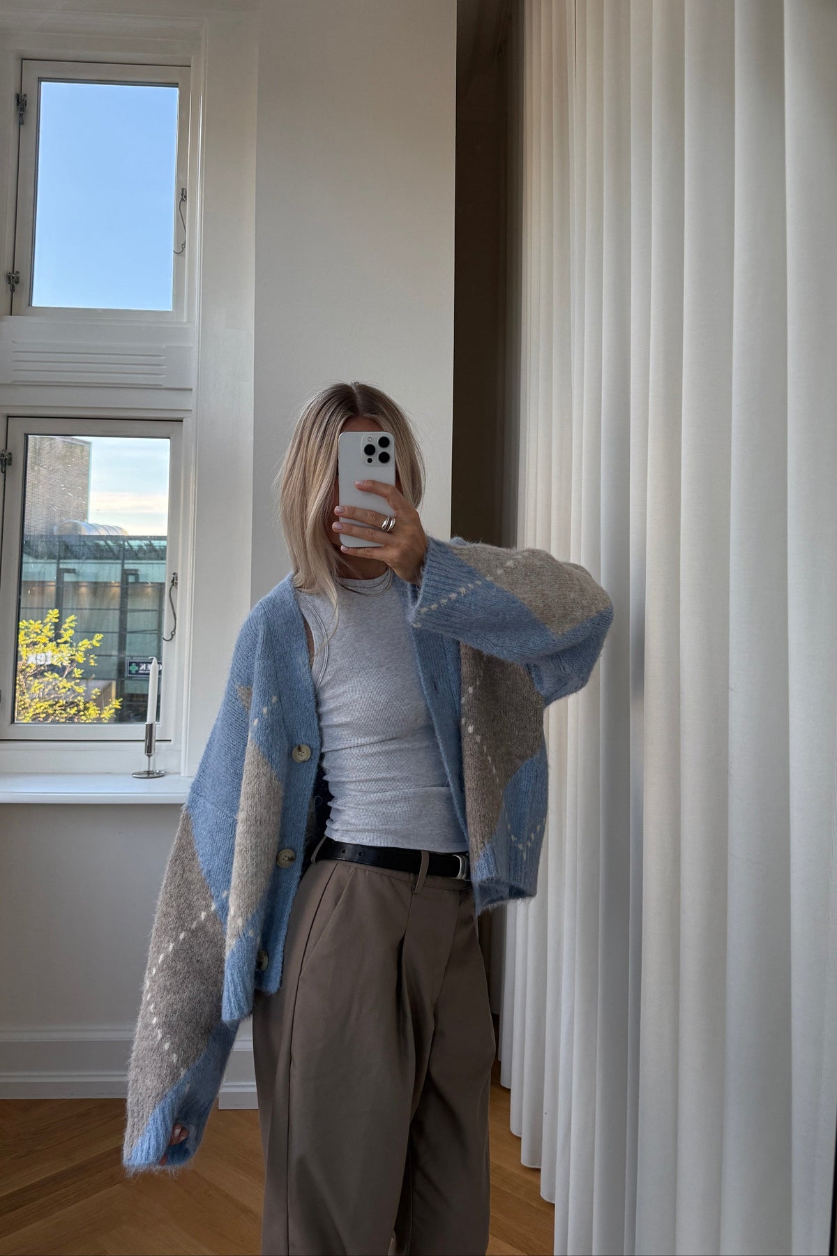 Gebreid vest van Noella met een klassiek argylepatroon in lichtblauwe en beige tinten. Het vest heeft een V-hals en drie knopen aan de voorkant.