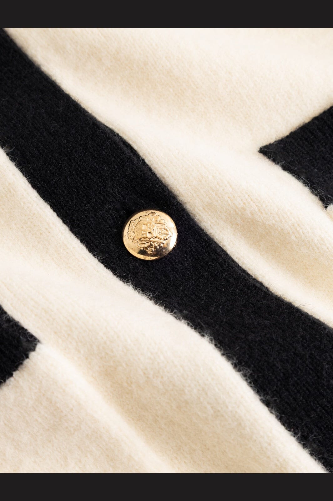 Wit gebreid vest van Noella met V-hals en slim fit-pasvorm. Het vest heeft lange mouwen en zwarte boorden bij de halslijn en de zakken.