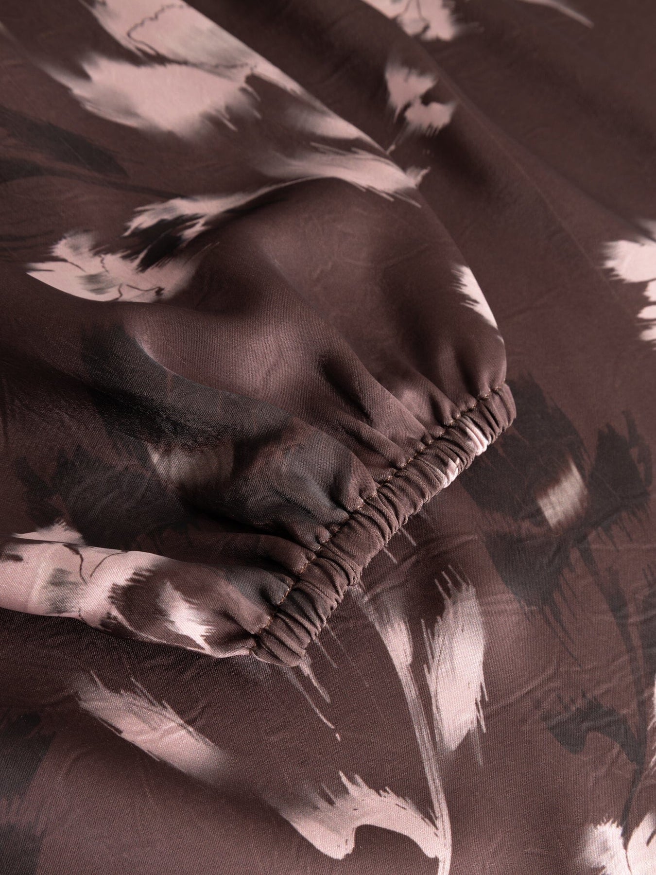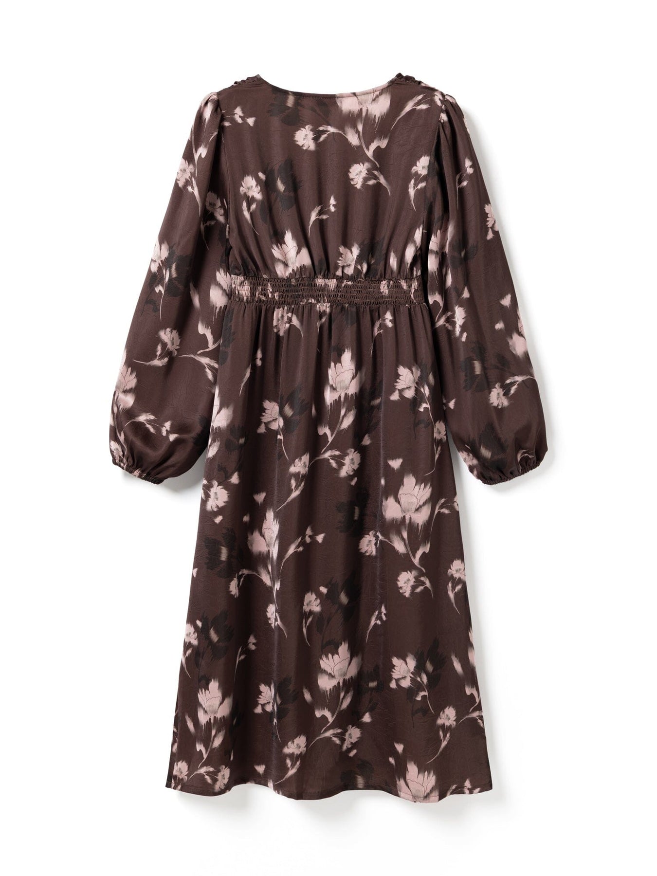 Jurk van Noella in bordeaux tinten met een bloemenprint in rode en bruine tonen. De jurk heeft lange mouwen, een V-hals met knoopdetails en een gemarkeerde taille.
