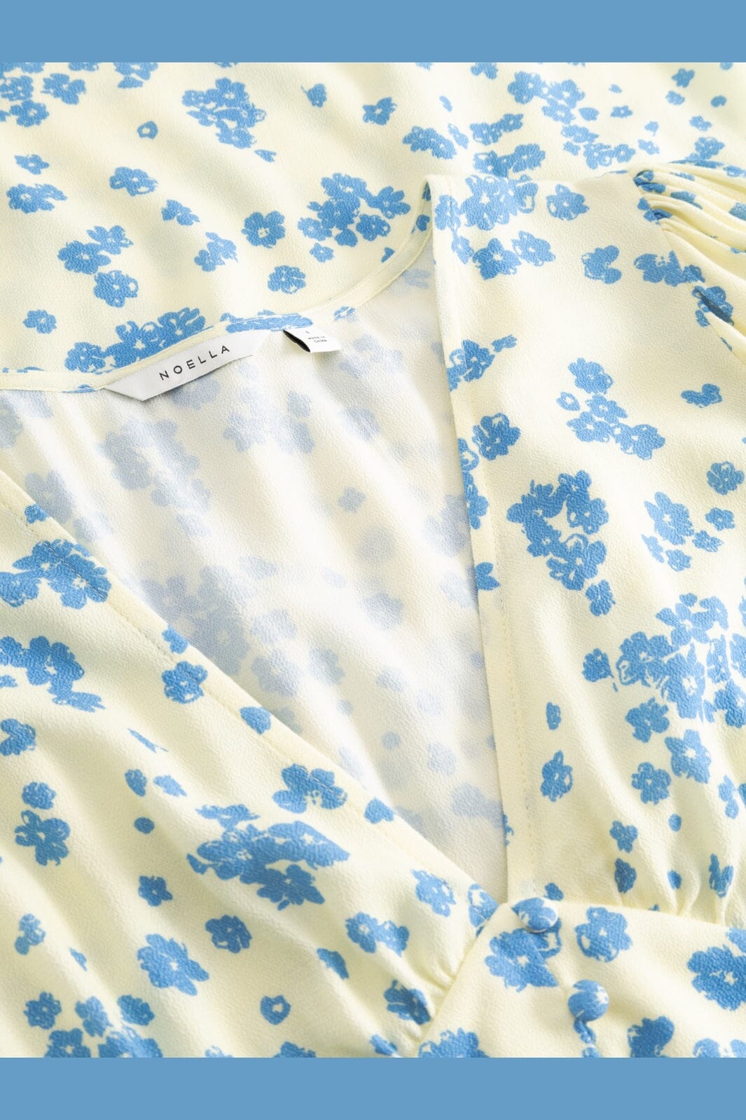 Jurk van Noella in geel met blauw bloemenpatroon. De jurk heeft een diepe V-hals en korte ballonmouwen met volume.