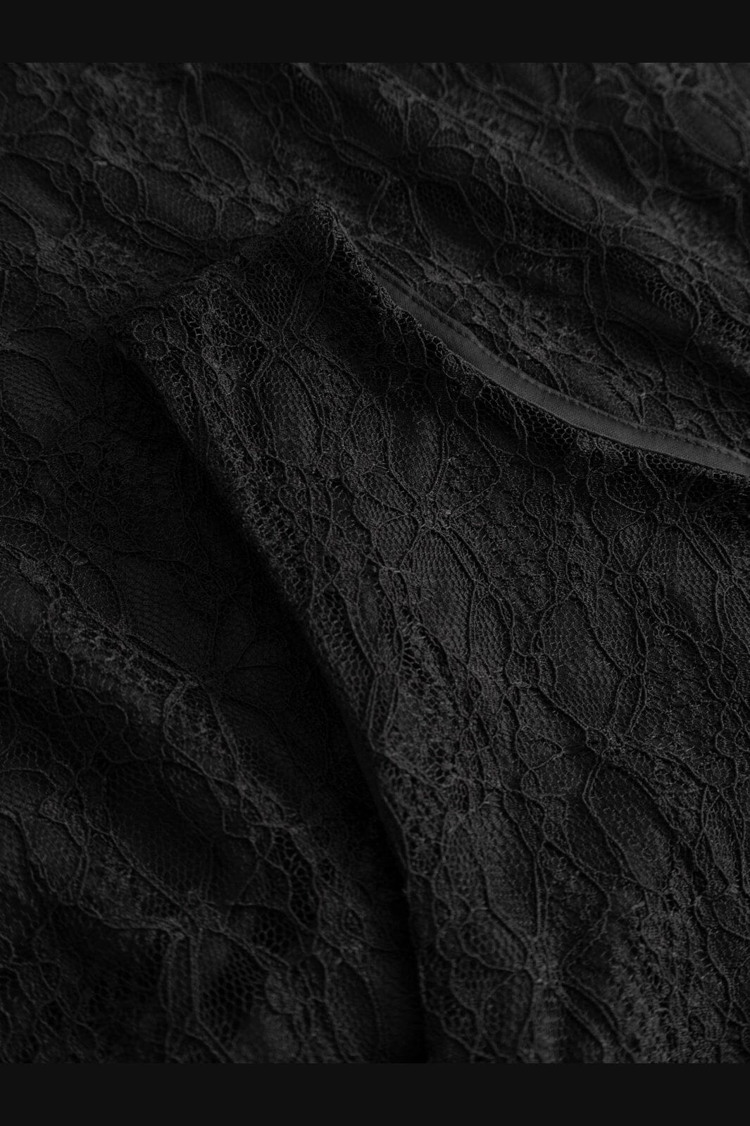 Zwarte jurk van Noella van kant. De jurk is geschikt voor bruiloften, feestjes en formele gelegenheden dankzij het off-shoulder design en de asymmetrische snit.