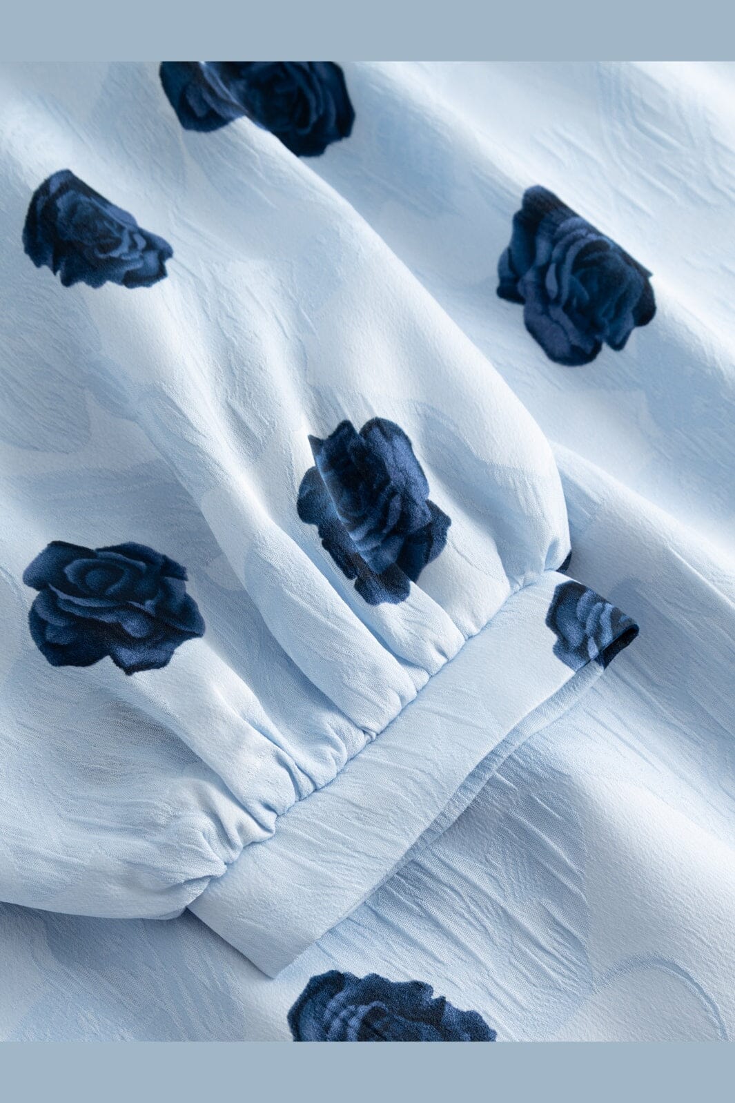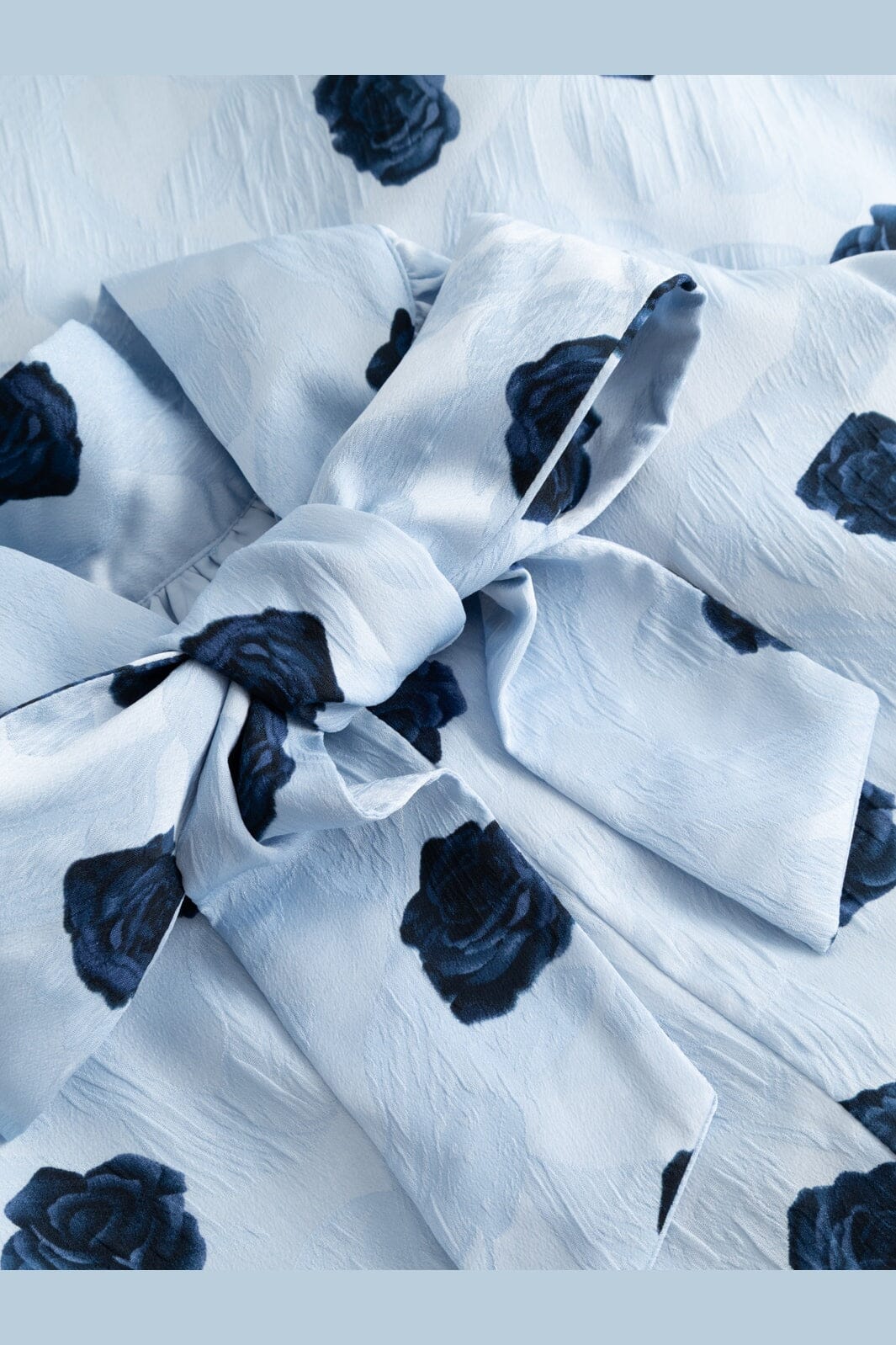Jurk van Noella in lichtblauw met donkerblauwe bloemenprint. De jurk heeft lange mouwen, een hoge halslijn met strik en een losse pasvorm.