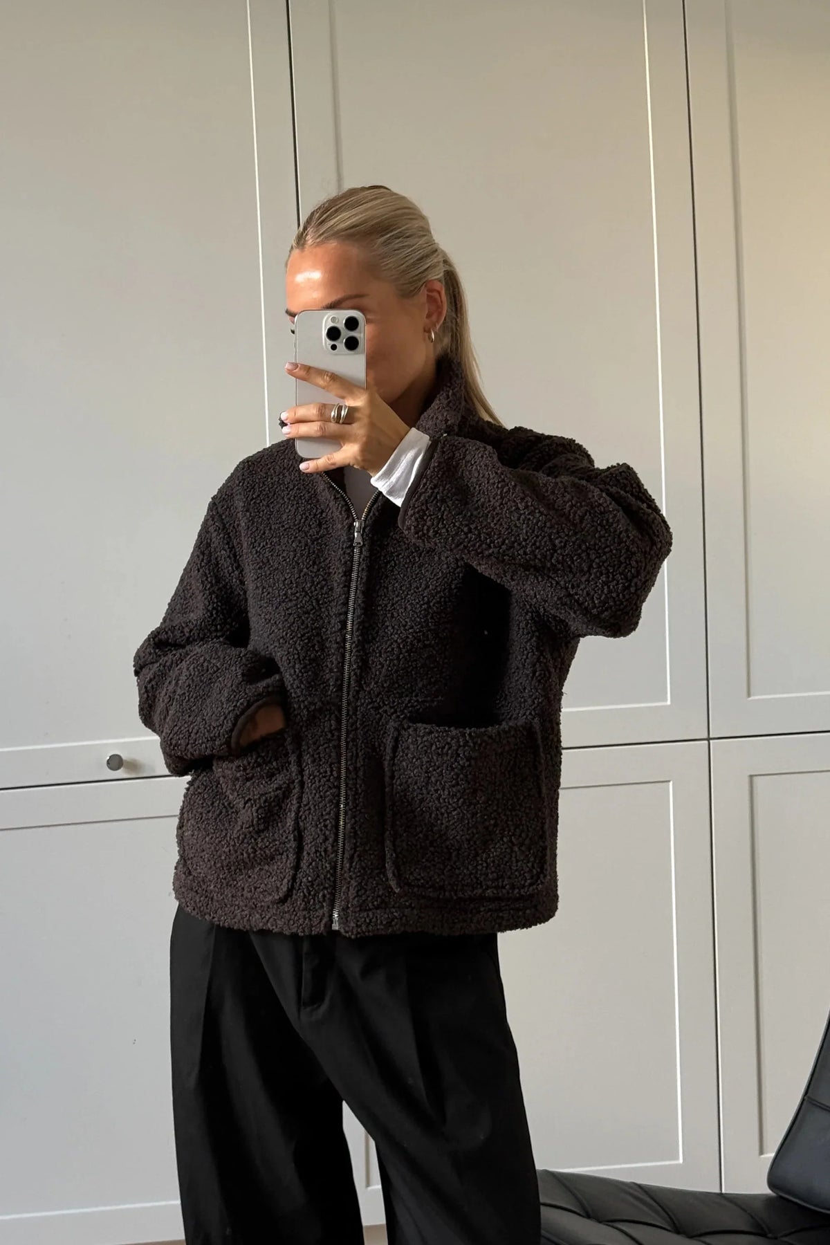 Jas fra Noella in chocoladebruin. De jas is gemaakt van zacht teddy-stof met een fluffy textuur en heeft een hoge kraag.