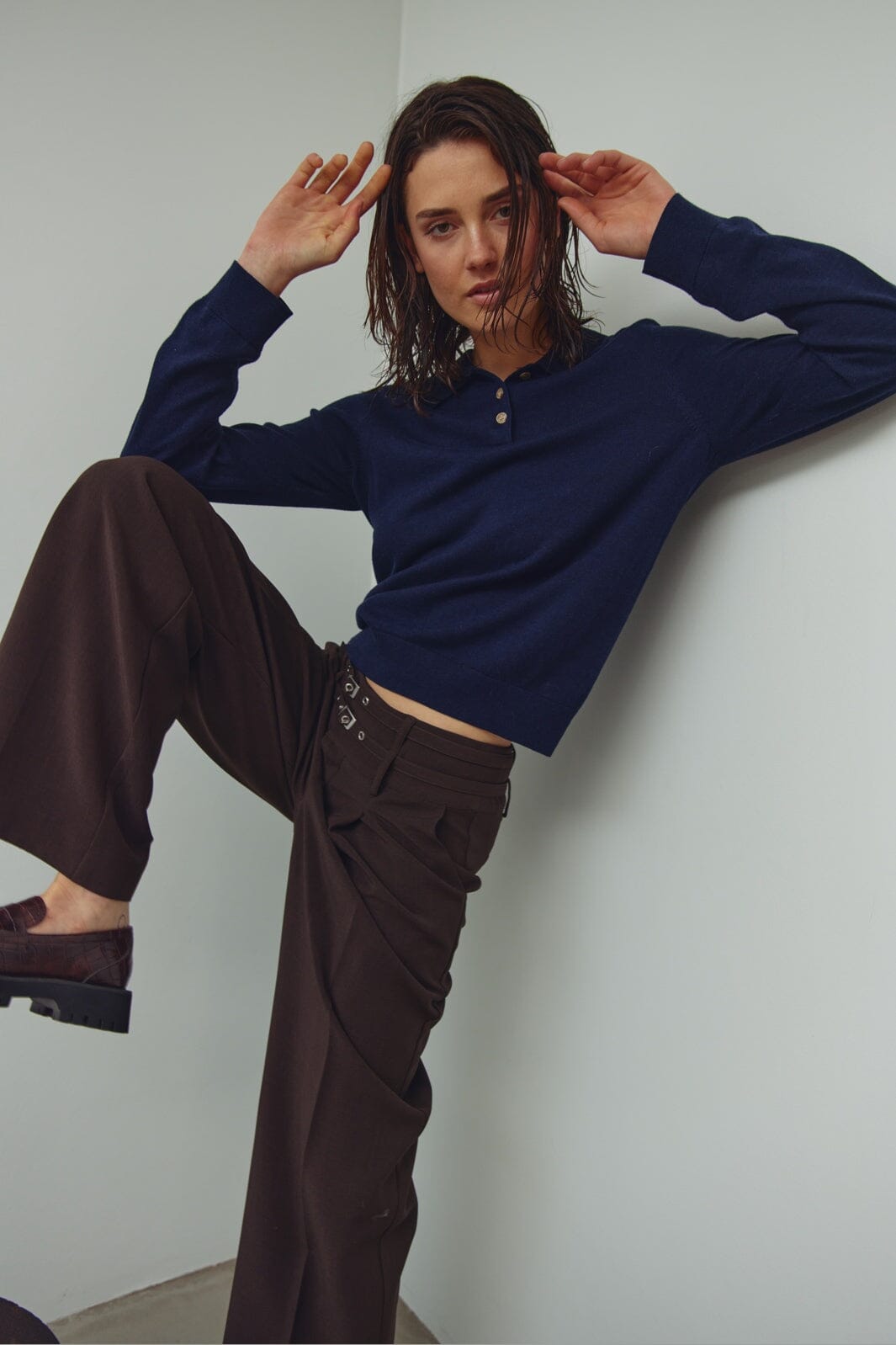 Gebreide trui van Noella in donkerblauw. De trui heeft een klassiek polodesign met knoopsluiting aan de voorkant en een gebreide structuur met een ontspannen pasvorm.