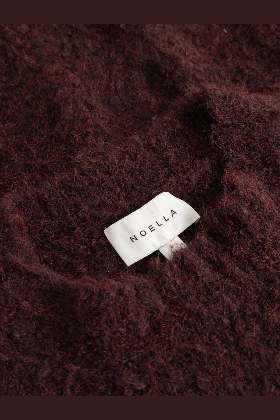 Gebreide trui van Noella, gemaakt van bouclégaren in een diepe wijnrode tint. De trui heeft een zachte en fluffy structuur.