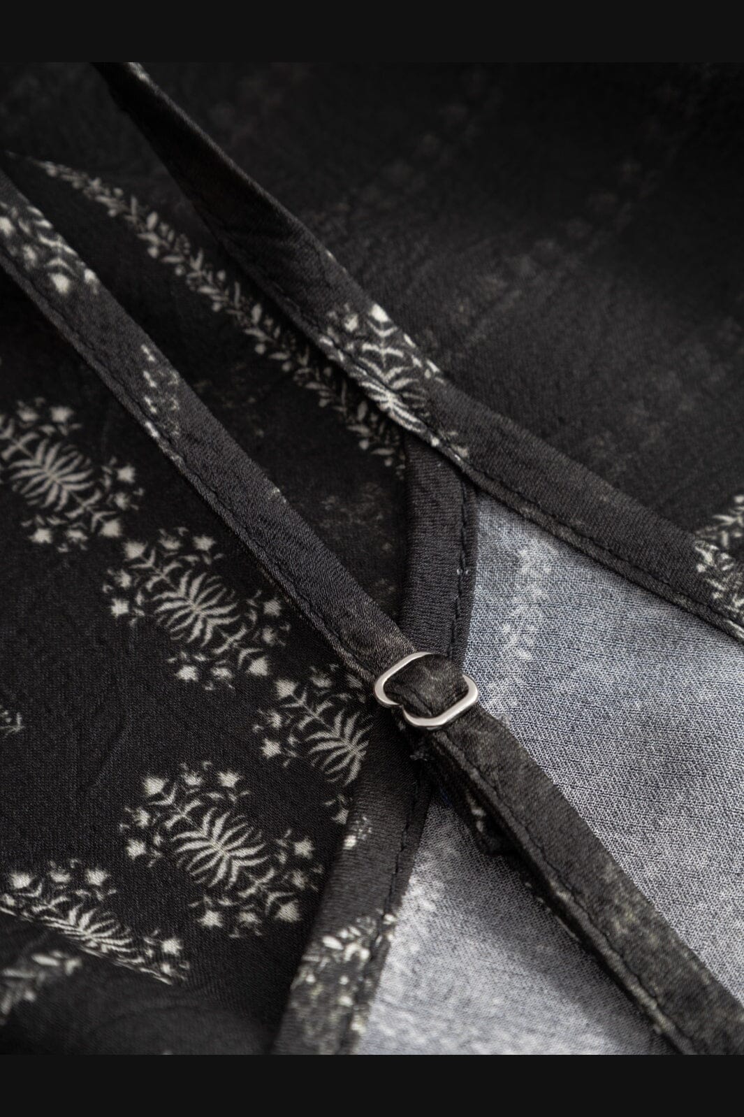 Zwarte jurk van Noella met geometrische print en bloemendetails. De jurk is geschikt voor zowel alledaagse als feestelijke gelegenheden.