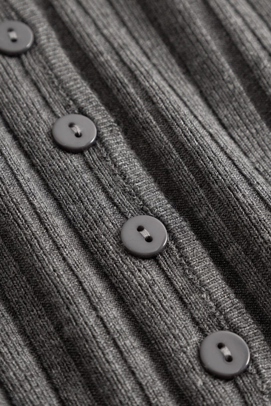 Grijsgemêleerde top van Noella, gemaakt van geribde viscose. De top heeft een diepe V-hals met knoopsluiting aan de voorkant en lange mouwen.