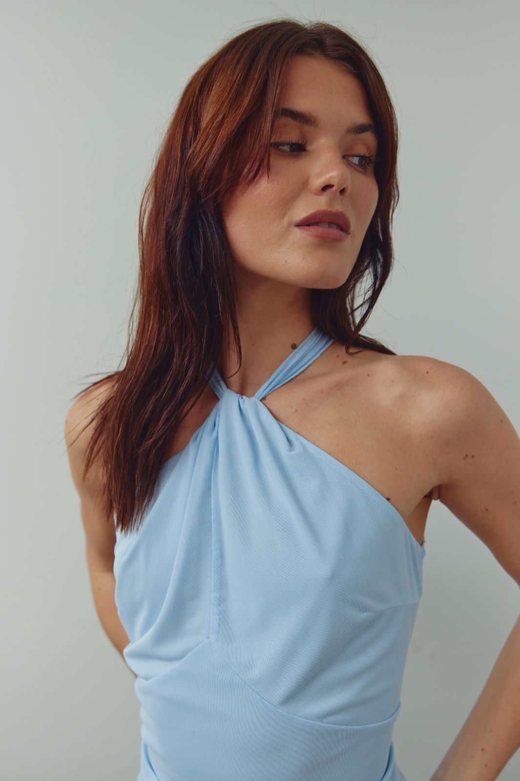 Lichtblau top van Noella, gemaakt van 100% polyester. De top heeft een halterneck-design met strikdetails op de rug en een open rug.