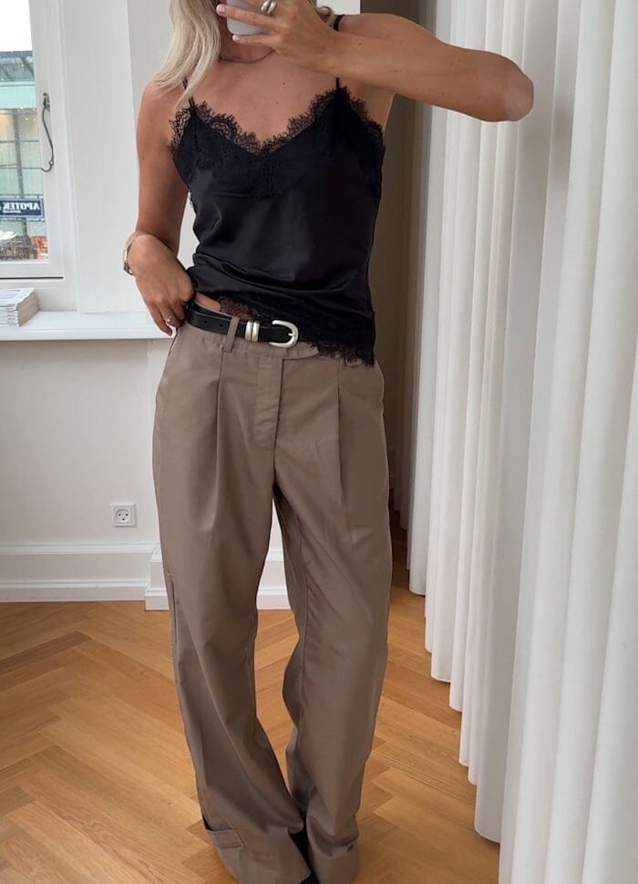 Zwarte satijnen blouse van Noella met V-hals en kanten details langs de halslijn en zoom. De blouse heeft dunne bandjes en een asymmetrische zoom.