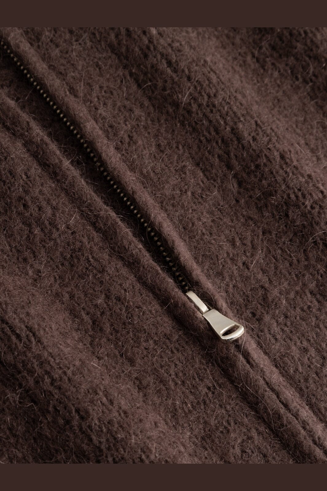 Gebreid vest van Noella in chocoladebruin. Het heeft een capuchon, ritssluiting aan de voorkant en een strikceintuur.