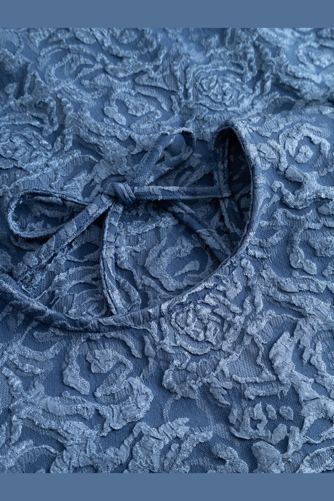 Lange jurk van Noella in stoffig blauw met bloemmotief. De jurk is gemaakt van jacquardstof met een structuur die de stof diepte geeft.