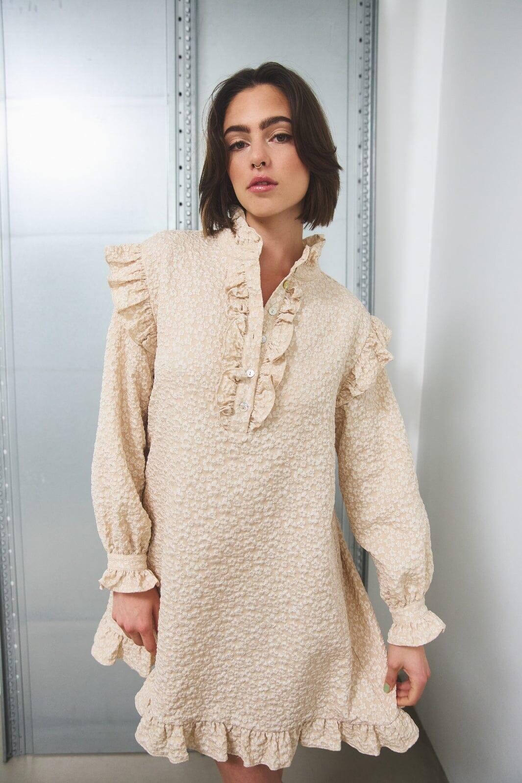 Jurk van Noella in een lichte oesterkleur met bloemenpatroon. Het heeft een hoge hals met ruches, knopen aan de voorkant en lange mouwen met ruches. De jurk eindigt met een ruchesrand onderaan.