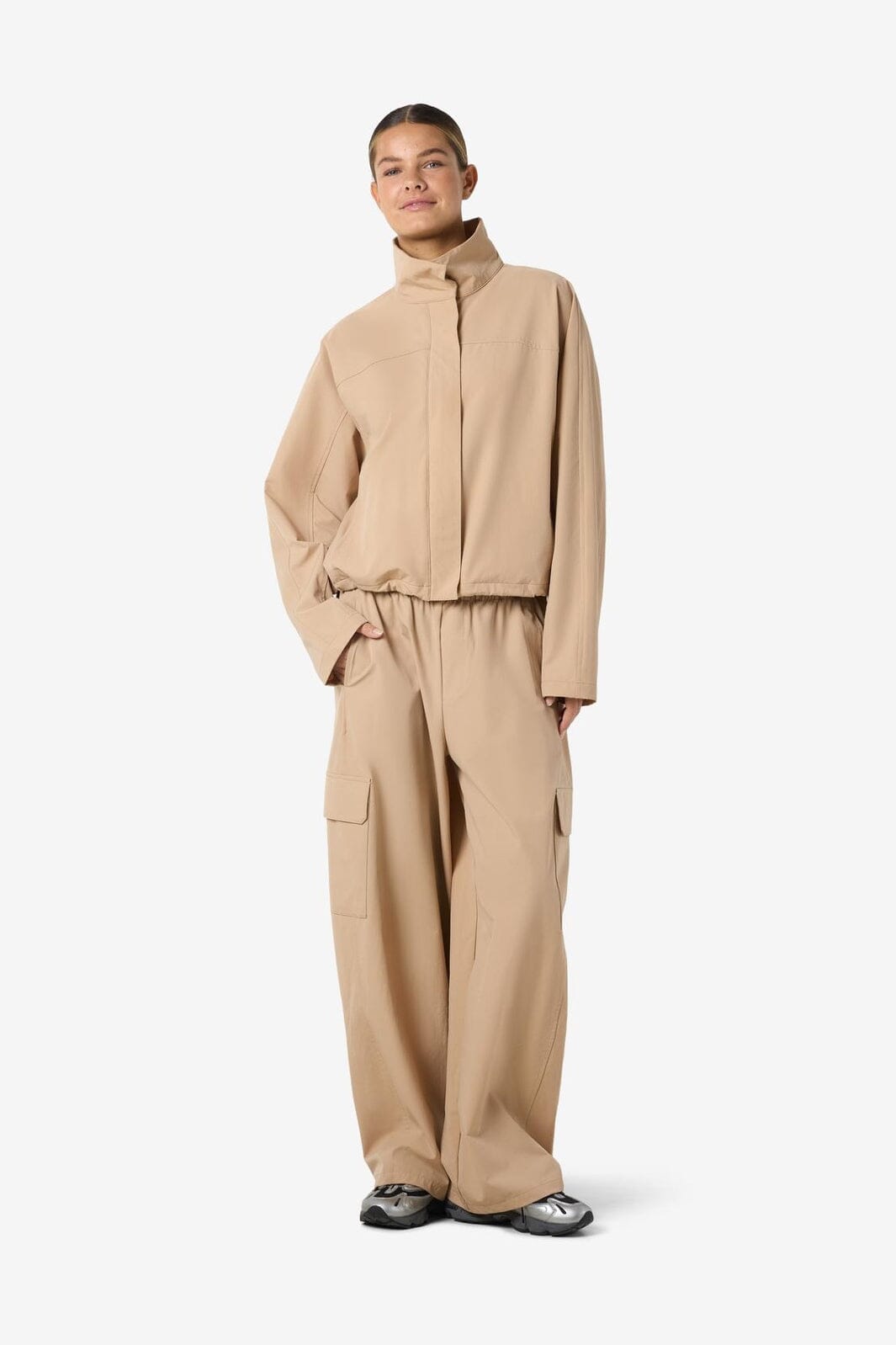Beige jas van Noisy May met hoge kraag, lange mouwen en een losse pasvorm. De jas heeft decoratieve stiksels en een elastische rand in de taille.