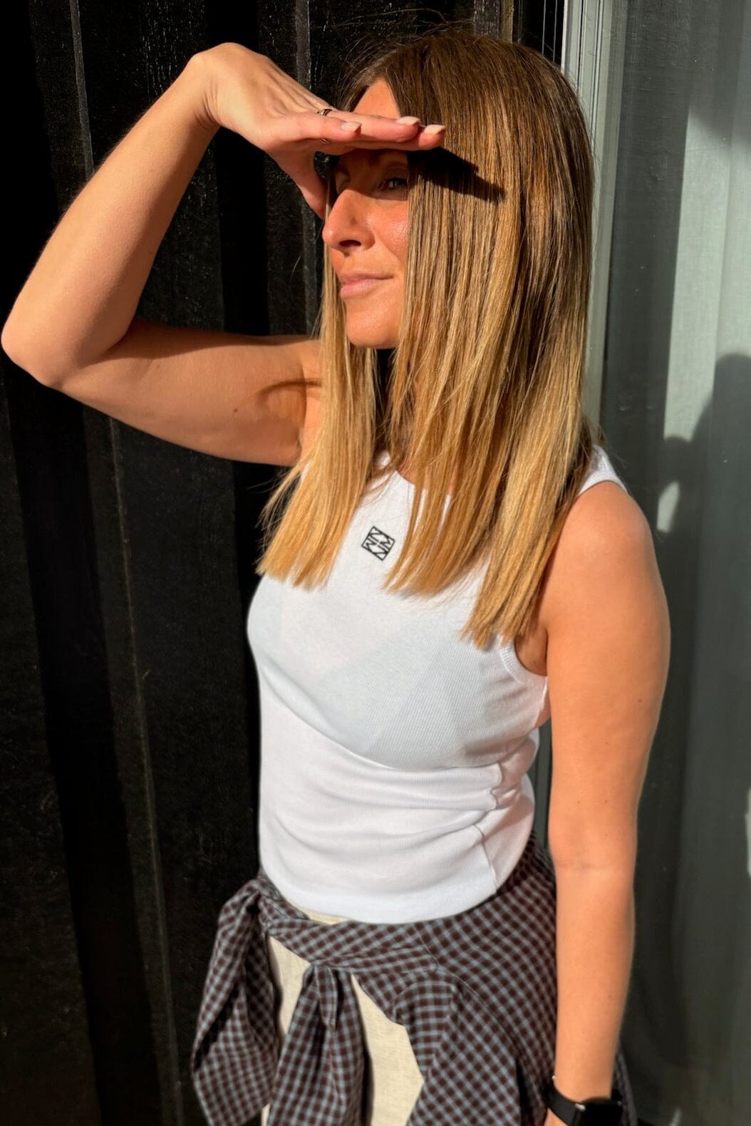 Witte tanktop van Noisy May met zwart geborduurd logo op de borst. Het heeft een ronde halslijn en een aansluitende pasvorm die de lichaamsvorm volgt.
