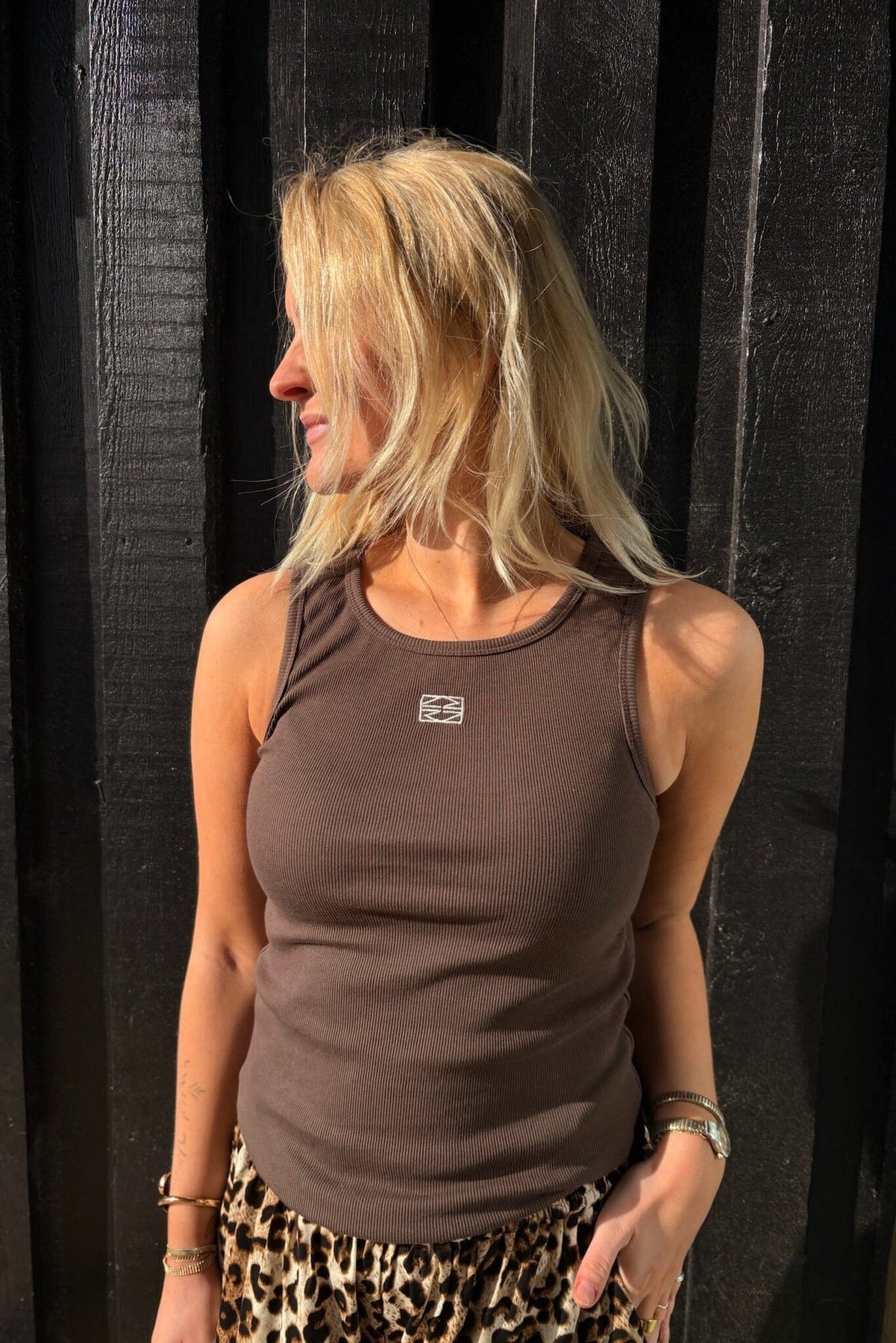 Chocoladebruine tanktop van Noisy May met ronde hals en mouwloos ontwerp. Het aansluitende model heeft een klein geborduurd logo op de voorkant.
