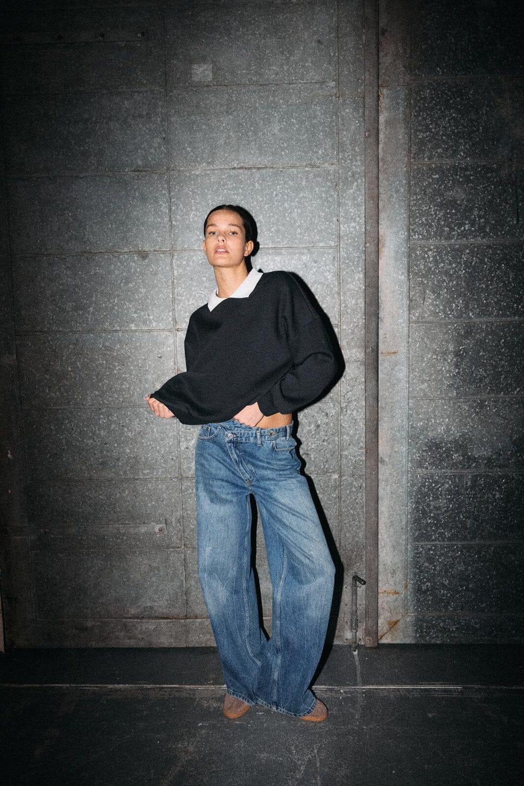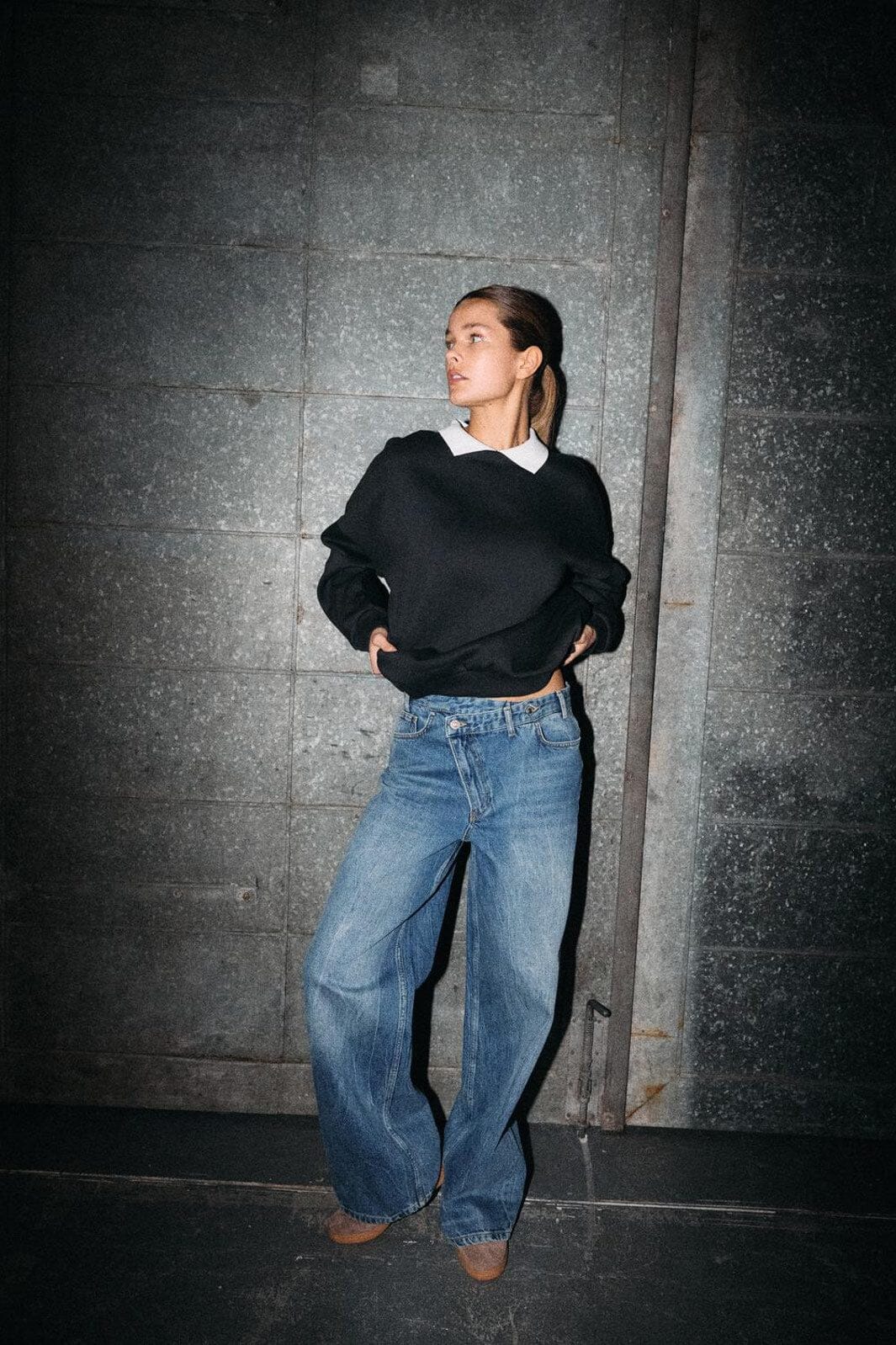 Brede jeans van Noisy May in middelblau denim met kruisdetail aan de voorkant. De brede pasvorm en de klassieke denimwas geven de broek een ontspannen uitstraling.