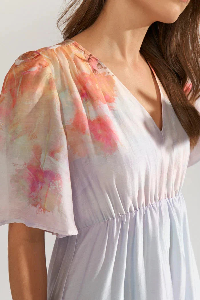 Lichtblau jurkje van Nümph met een kleurrijke bloemenprint en ombre-effect langs de zoom. De jurk heeft een luchtige lichtblauwe basis die naar beneden toe geleidelijk overgaat in oranje en roze bloemmotieven.